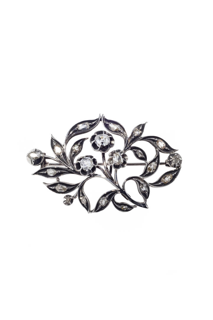 in argento ed oro a bassa caratura, a forma di voluta, XIX secolo con rosette di diamanti e diamanti taglio vecchio per totali ct 1,20 ca