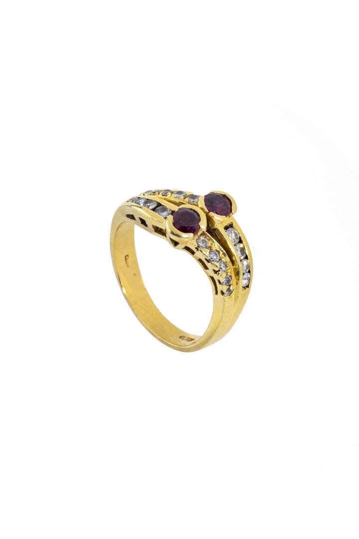 in oro giallo, composto da due fedine con due rubini taglio rotondo per totali ct 0,50 ca e diamanti taglio brillante per totali ct 0,25 ca