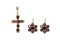 in oro giallo composta da coppia di orecchini, a monachella, con fiori in granati taglio rotondo e ciondolo a forma di croce con granati taglio ovale