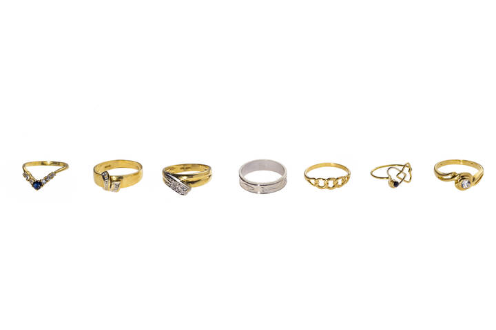 - in oro bianco sommità a "v" con diamanti taglio brillante per totali ct ca ed uno zaffiro taglio rotondo. Peso gr 2,1. Misura 12 (52)