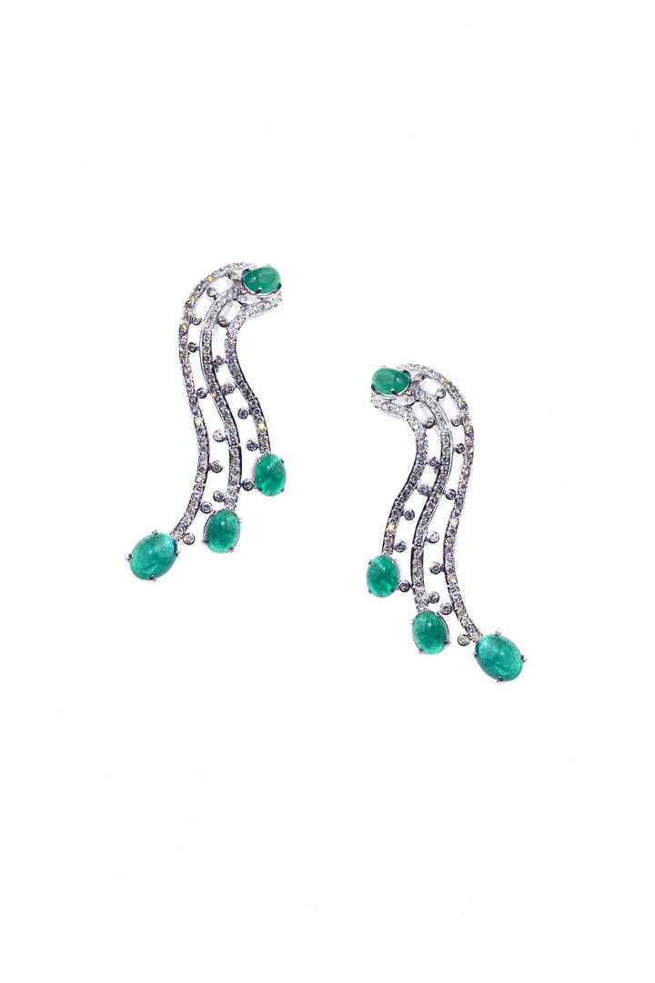 pendenti, in oro bianco, a volute con sei file mosse in diamanti taglio brillante per totali ct 2,0 ca e impreziosite da smeraldi taglio ovale cabochon per totali ct 16 ca
