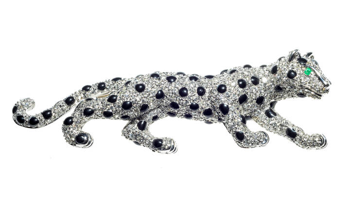 Spilla in oro bianco, marcata "Legnazzi" (1932 Al), a forma di pantera, con diamanti taglio brillante (uno mancante) per totali ct 4,50 ca e smalto nero. Uno smeraldino come occhio