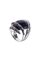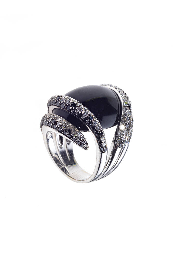 Anello in oro bianco, firmato "Crivelli", al centro grande onice cabochon trattenuto da fasce in diamanti taglio brillante di colore bianco e nero per totali ct 3 ca