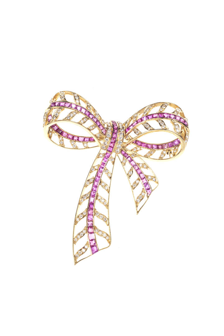 in oro giallo, a forma di fiocco, con diamanti taglio brillante per totali ct 1,25 ca e rubini taglio carré per totali ct 6,0 ca