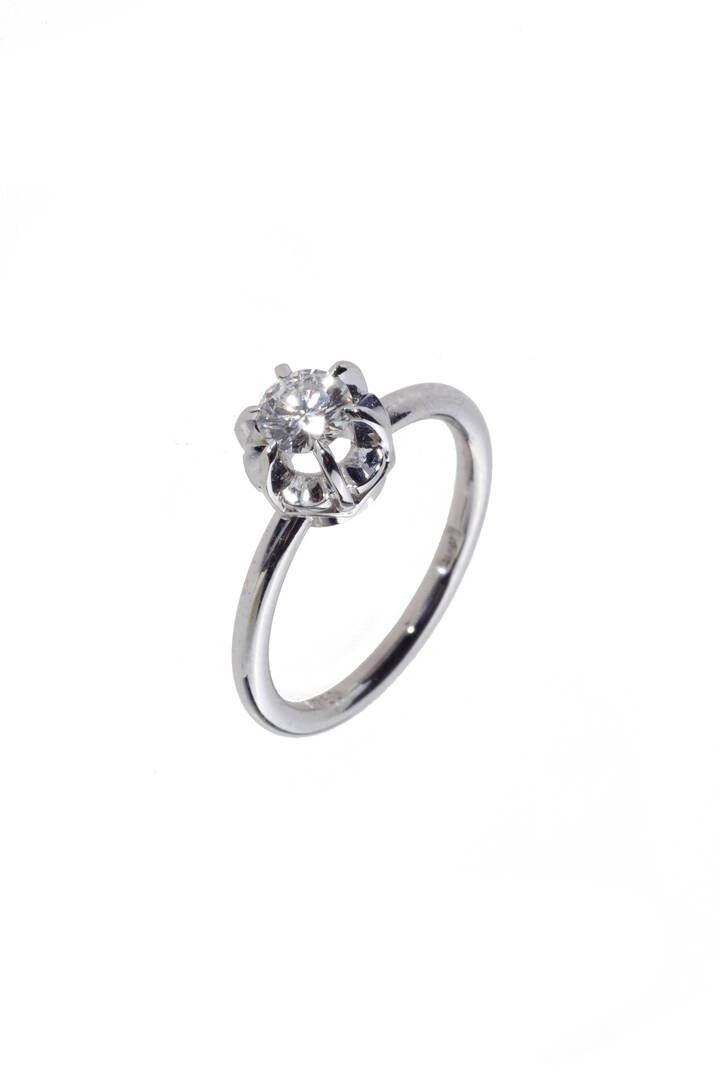 in oro bianco, con diamante solitario taglio brillante di ct 0,47 ca, probabile colore G-H, purezza IF-VVS