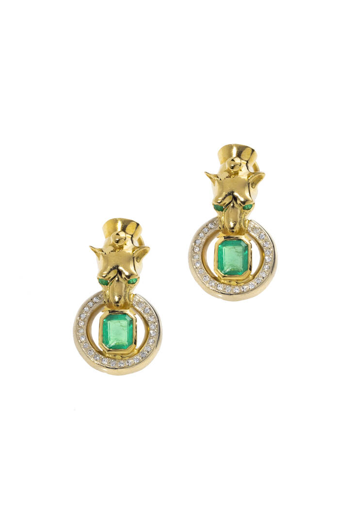 in oro giallo, a clip, con pantere e due smeraldi taglio ottagonale a gradini per totali ct 2,0 ca e piccoli diamanti taglio 8/8 per totali ct 0,40 ca