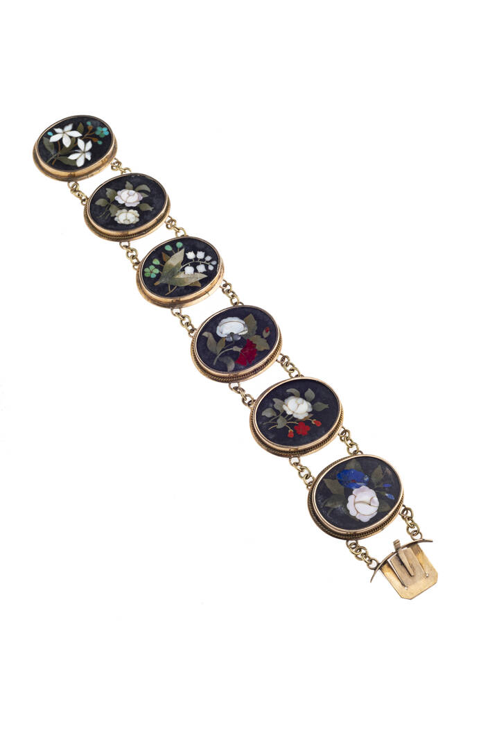 in oro rosa a bassa caratura, XIX secolo, con sei ovali raffiguranti fiori in commesso di pietre dure