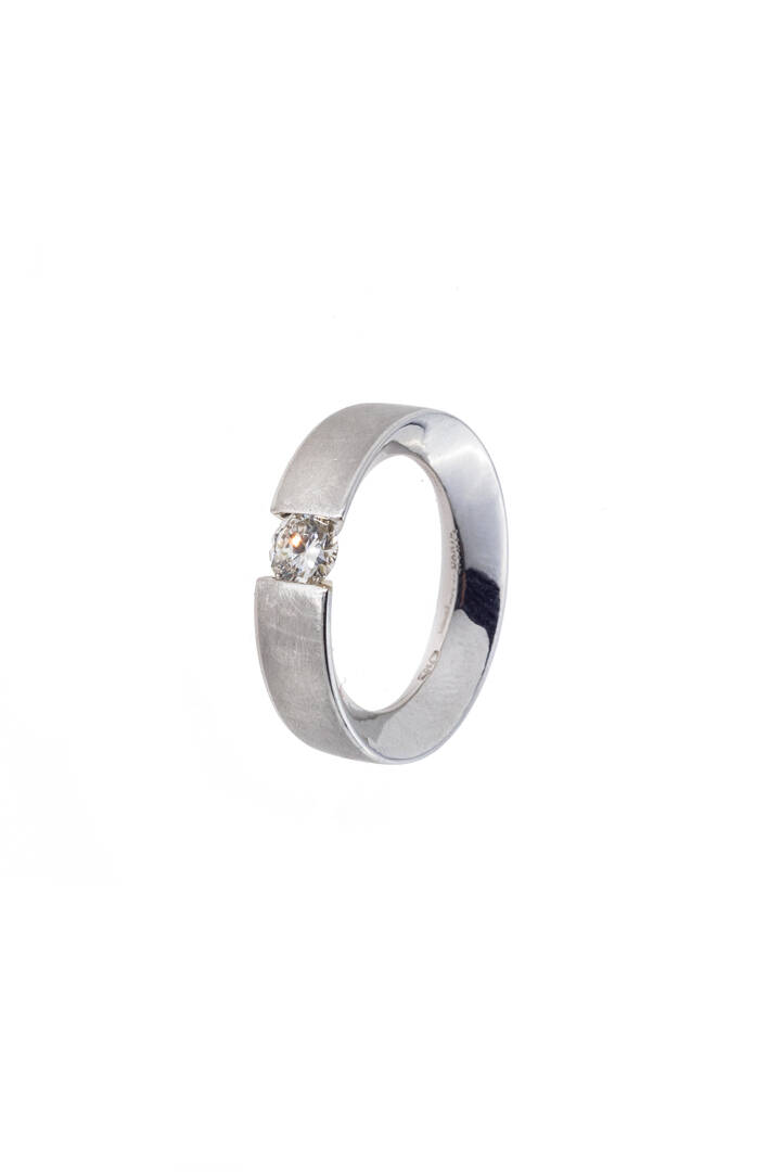 Anello in oro bianco lucido e satinato, firmato "Dante di Lilla", a fascia, al centro diamante taglio brillante di ct 0,40 ca