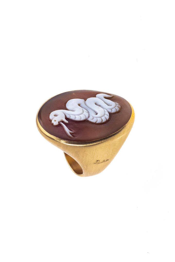 Anello in oro giallo satinato, firmato "Pomellato", modello "Eva", al centro cammeo ovale inciso con l'immagine di un serpente