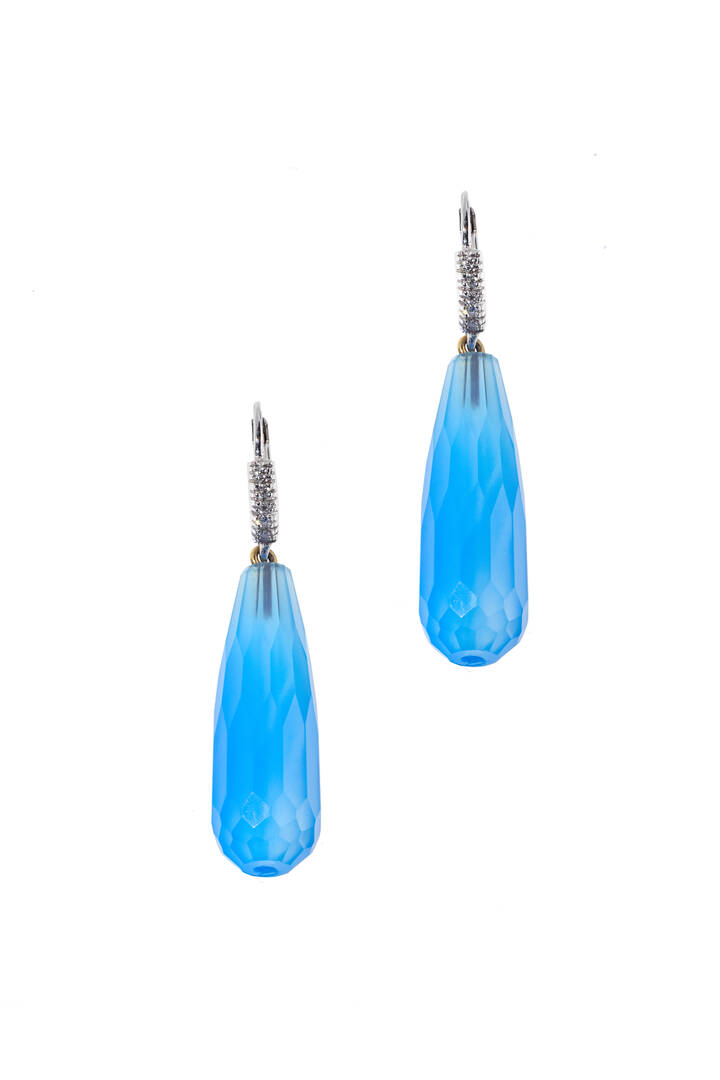 in oro bianco, a monachella, con due gocce briolette di calcedonio celeste; diamanti taglio brillante per totali ct 0,13 ca