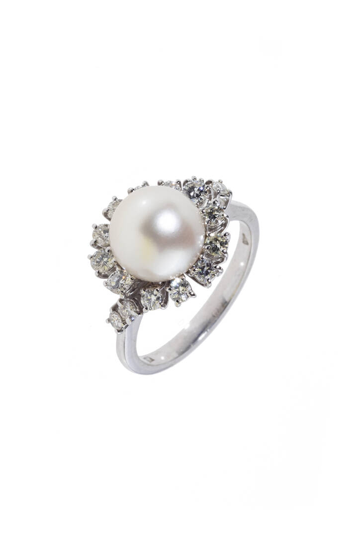 in oro bianco, con perla giapponese del diam di mm 10 ca trattenuta da onde in diamanti taglio brillante per totali ct 0,65 ca, probabile colore G-H, purezza IF-VVS