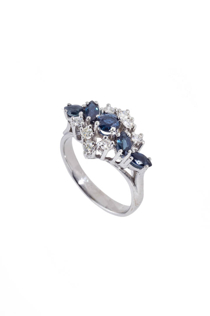 in oro bianco, sommità a cespuglio, con zaffiri taglio rotondo e navette per totali ct 0,70 ca e diamanti taglio brillante per totali ct 0,20 ca
