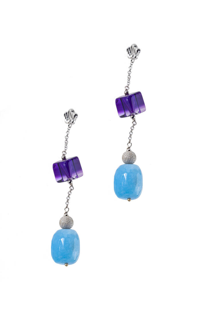 pendenti in oro bianco con cubi di ametiste idrotermali e ovali cabochon di acquamarina milk