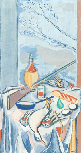Orfeo Tamburi Natura morta con cacciagione Olio e tecnica mista su tela cm. 135x74 Firmato in basso a destra.
