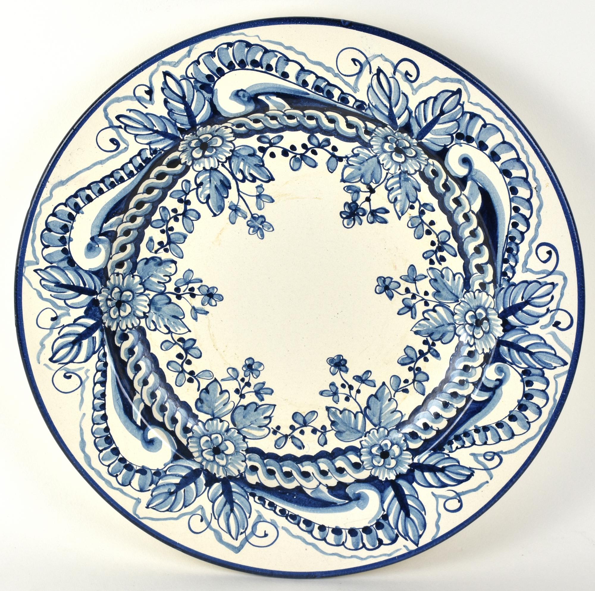 GRANDE PIATTO DA PARATA in ceramica decorata blu su fondo crema diam cm 41