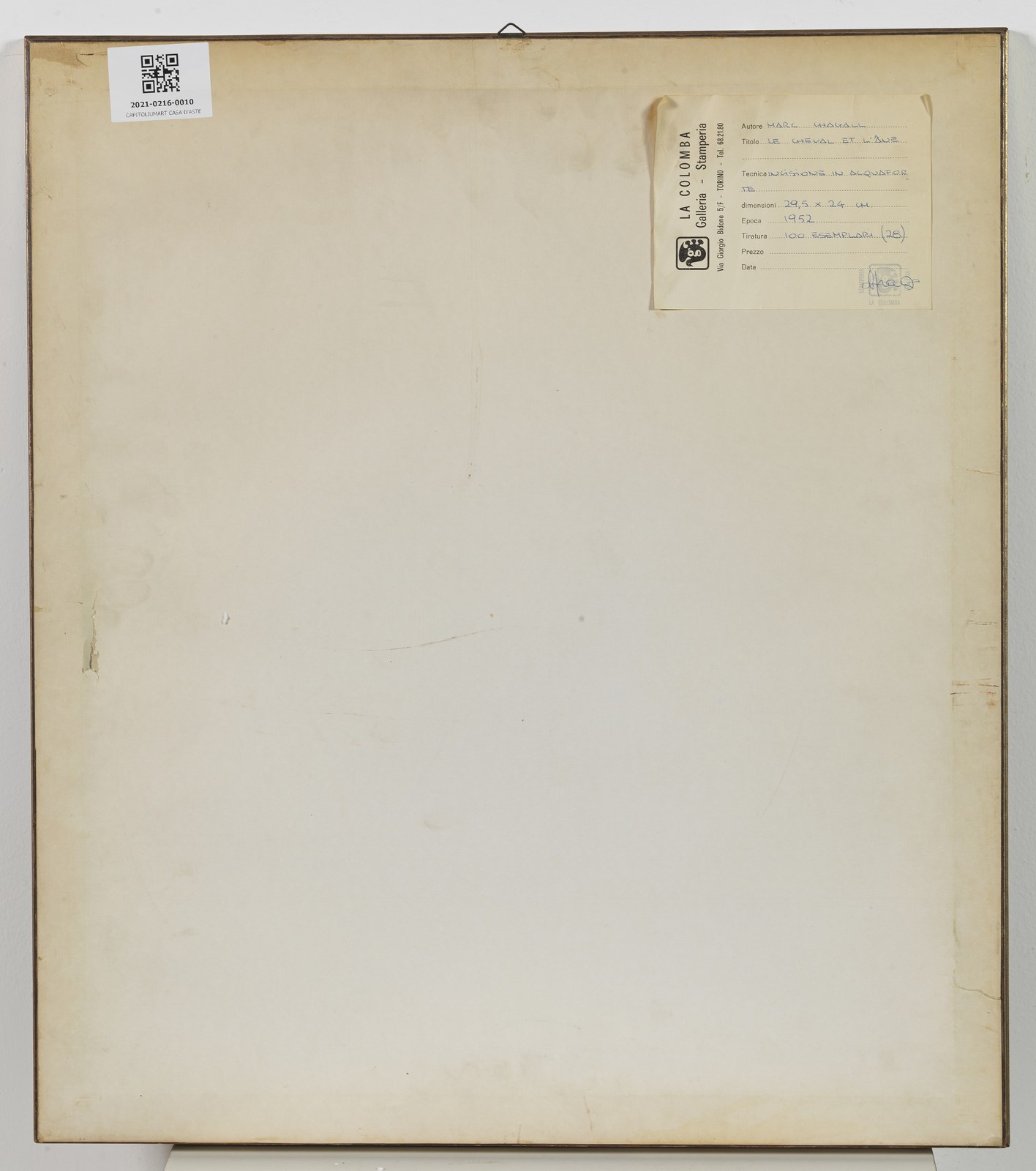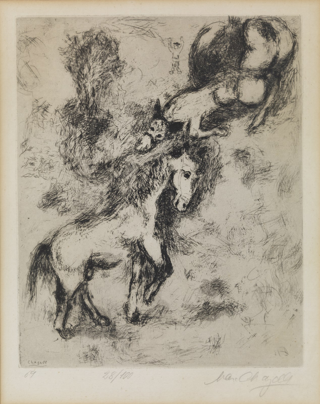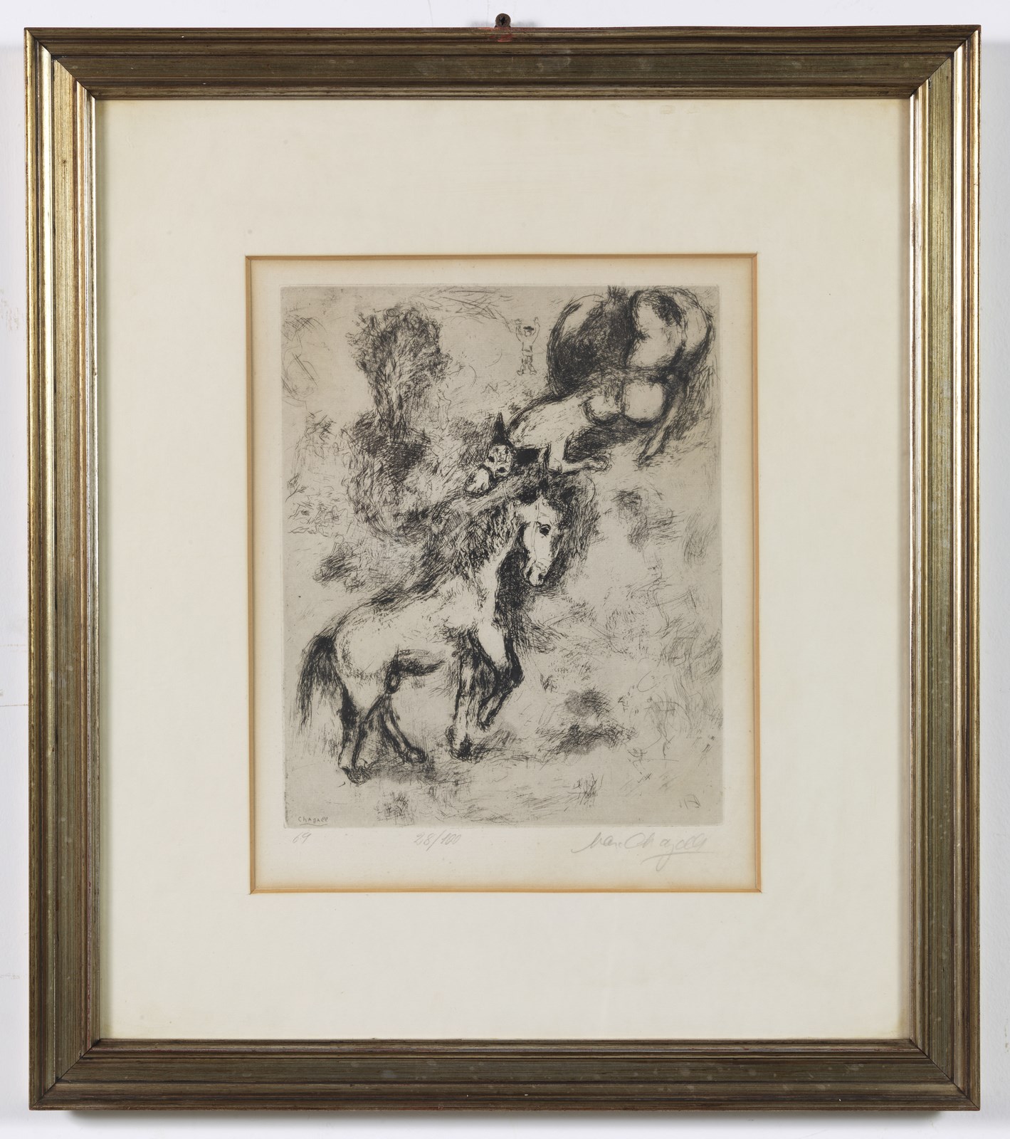 CHAGALL MARC (1887 - 1985) Fables de la Fontaine series:Le Cheval et l'Ane. 1952. Acquaforte. Cm 33,50 x 41,50. 28/100. Firma e tiratura a matita in basso. Firma in lastra in basso a sinistra. Al retro cartiglio descrittivo della Galleria La Colomba,Torino. Dimensione lastra: 29.5x24 cm. Editore:Tériade, Parigi. Le Cheval et l'âne (Il cavallo e l'asino) fa parte di una serie di opere edite da Ambroise Vollard nel 1926 e successivamente riprese da Tériade, Paris, nel 1950. Questa incisione è inclusa nell'edizione in due volumi delle Favole, "Fables, Eaux-fortes originales de Marc Chagall", pubblicata da Tériade nel Febbraio 1952. Esposizione: Galeries Maeght, Parigi, 1952. Bibliografia: Catalogue raisonné Cramer des livres / portfolio de Marc Chagall sous la réf. #22. Cornice presente