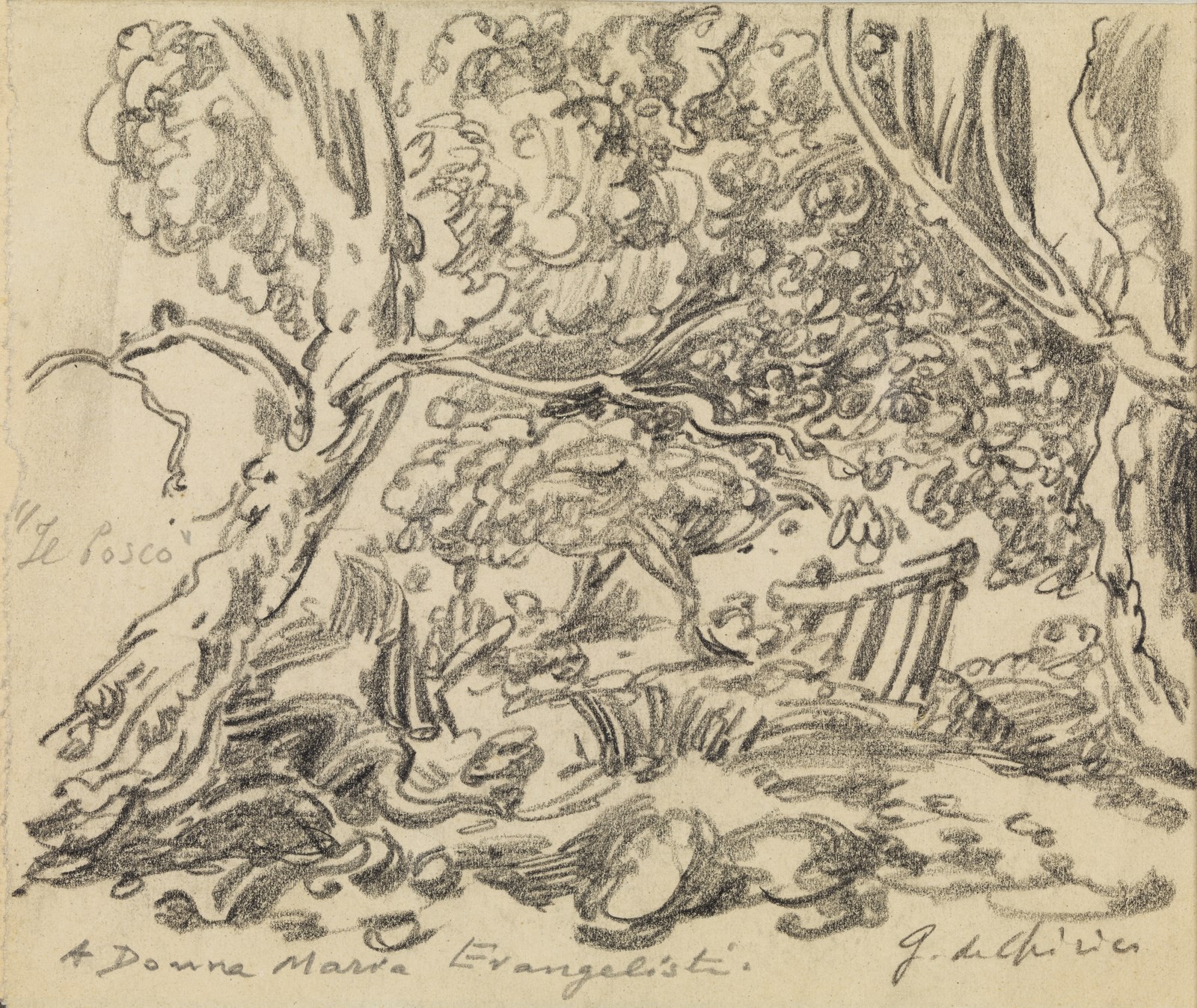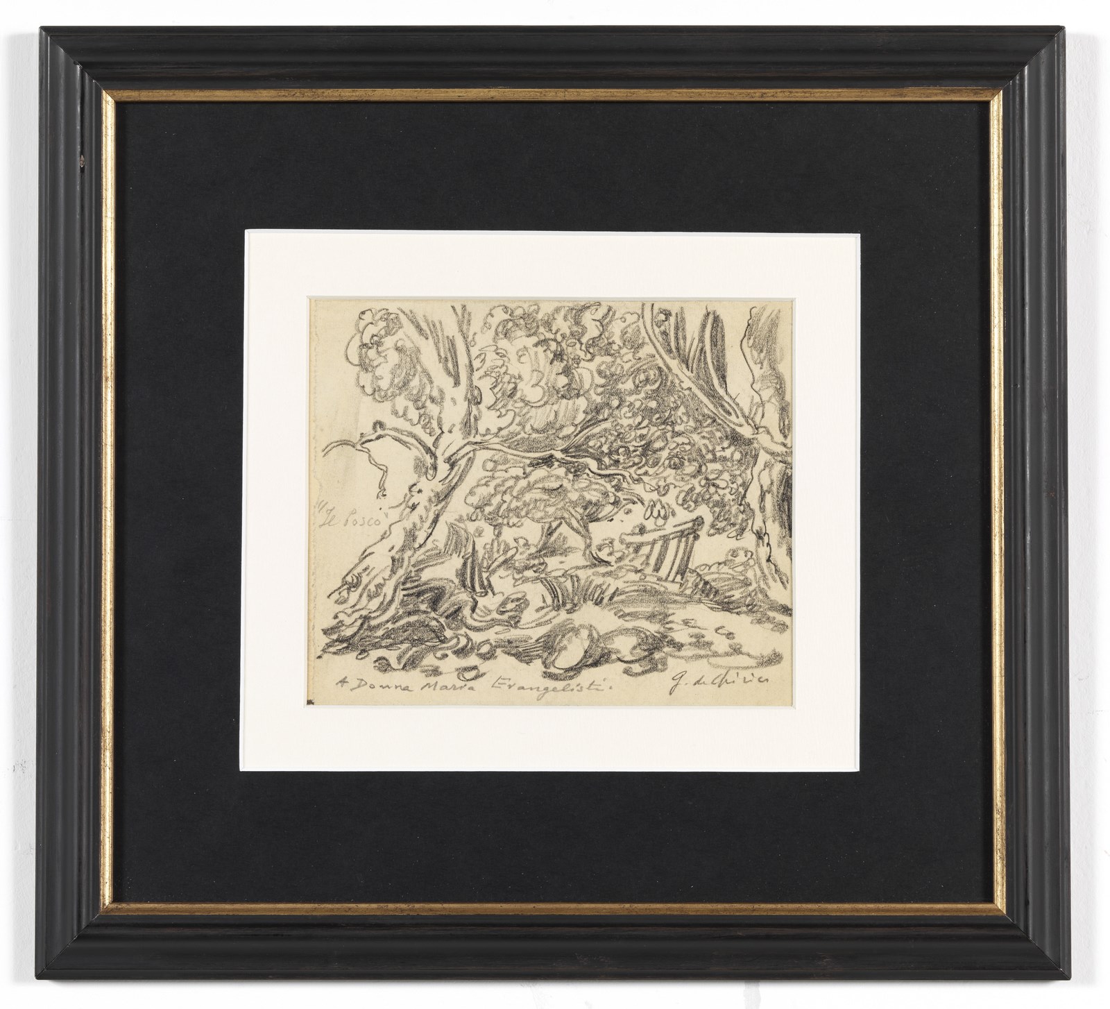 DE CHIRICO GIORGIO (1888 - 1978) Il bosco. Matita su carta. Cm 16,80 x 13,70. Firma in basso a destra. Databile 1950 circa. Opera archiviata presso la Fondazione Giorgio e Isa De Chirico, Roma, come da documentazione fotografica allegata all'opera riportante il relativo numero d'inventario. Cornice presente