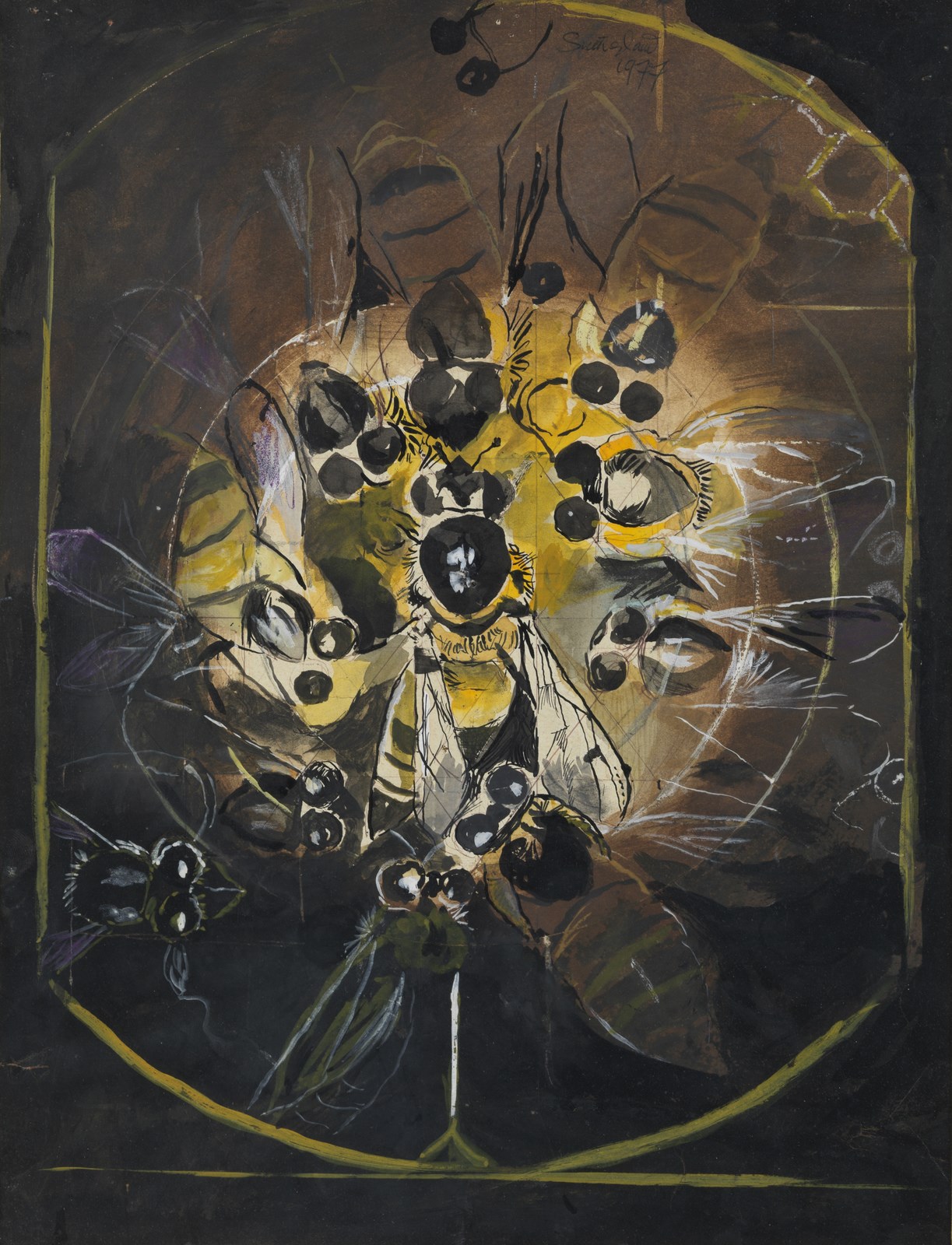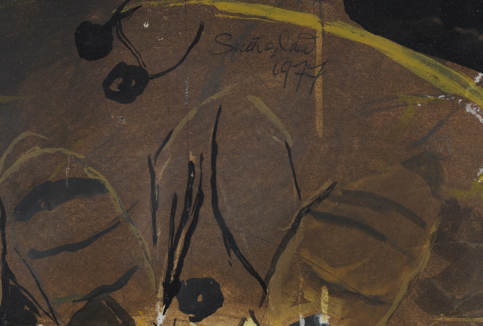 SUTHERLAND GRAHAM (1903 - 1980) Senza titolo. 1977. Tecnica mista su carta. Cm 32,00 x 41,00. Firma e anno in alto a destra. Provenienza: Galleria Ruggerini e Zonca, Milano. Difetti. Cornice presente