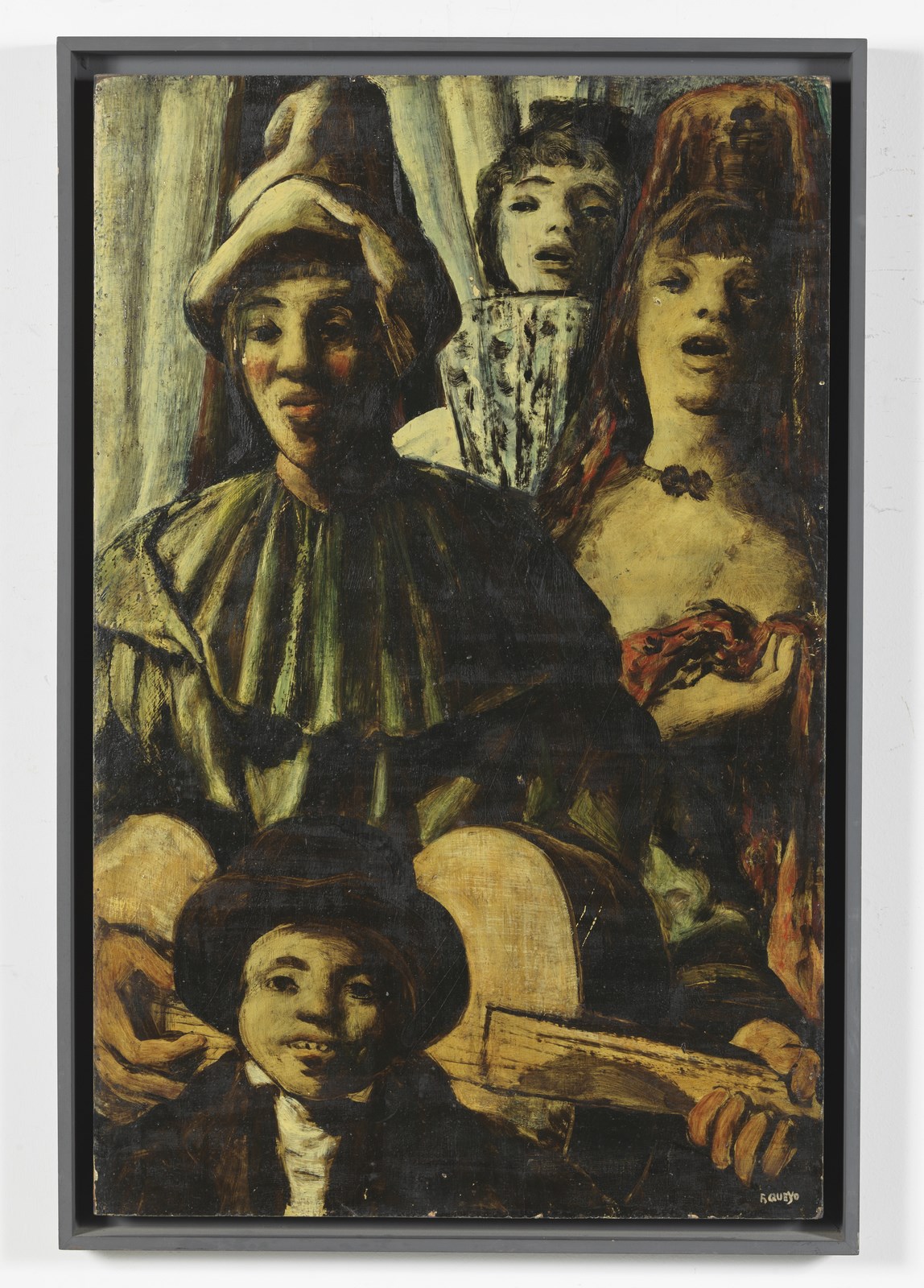 FIUME SALVATORE (1915 - 1997) Compagnia di pagliacci con il nano. 1946. Olio su tavola. Cm 52,00 x 82,00. Firmato in basso a destra F. Queyo. Opera archiviata presso la Fondazione Salvatore Fiume - Laura Fiume, Canzo, come da documentazione fotografica allegata all'opera riportante il relativo numero d'inventario. Provenienza: Collezione privata, Milano.