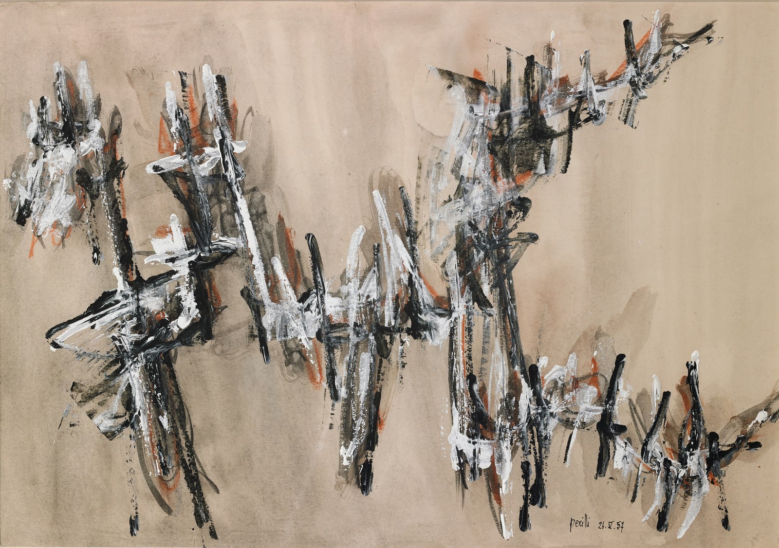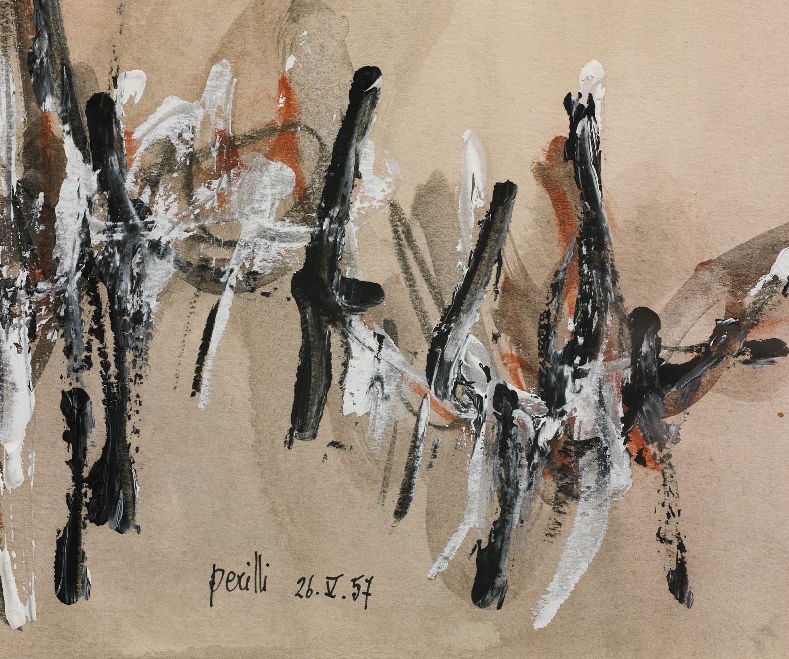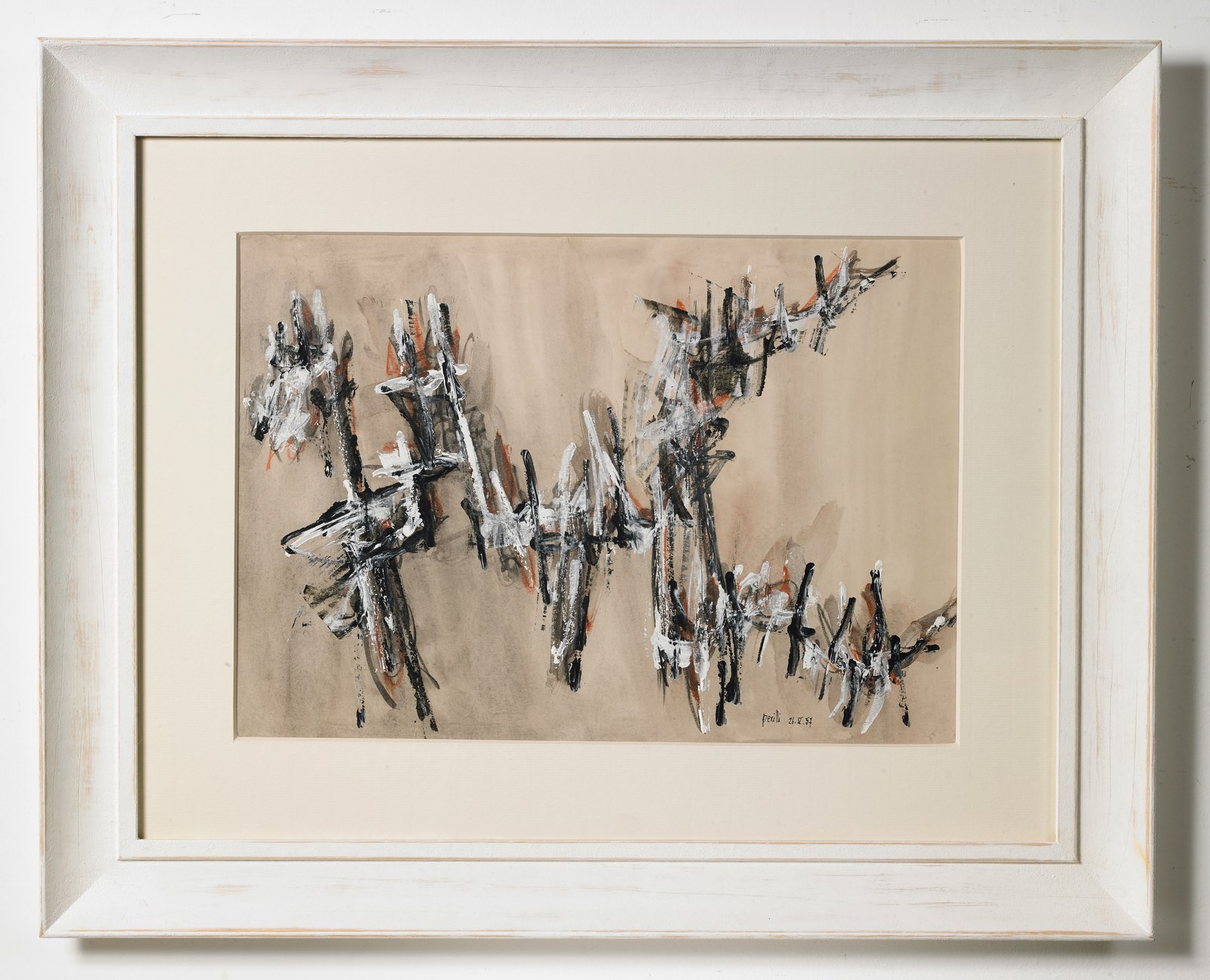 PERILLI ACHILLE (n. 1927) Senza titolo. 1957. Tecnica mista su carta. Cm 49,60 x 34,70. Firma e anno in basso a destra. Opera archiviata presso l'Archivio Achille Perilli, Milano, come da documentazione fotografica allegata all'opera riportante il numero d'inventario e la firma dell'artista. Cornice presente