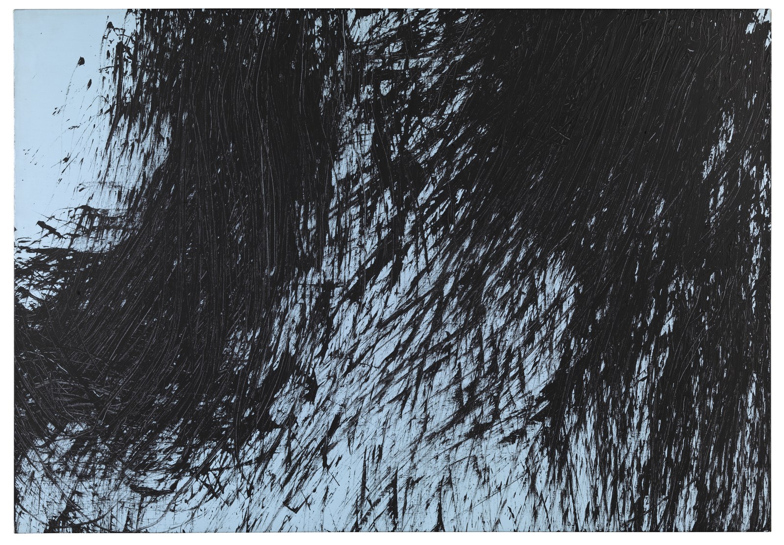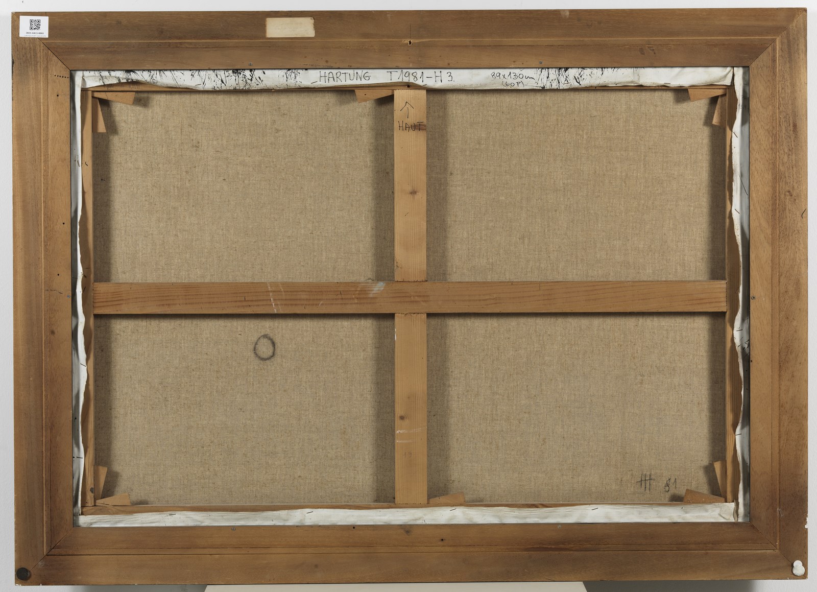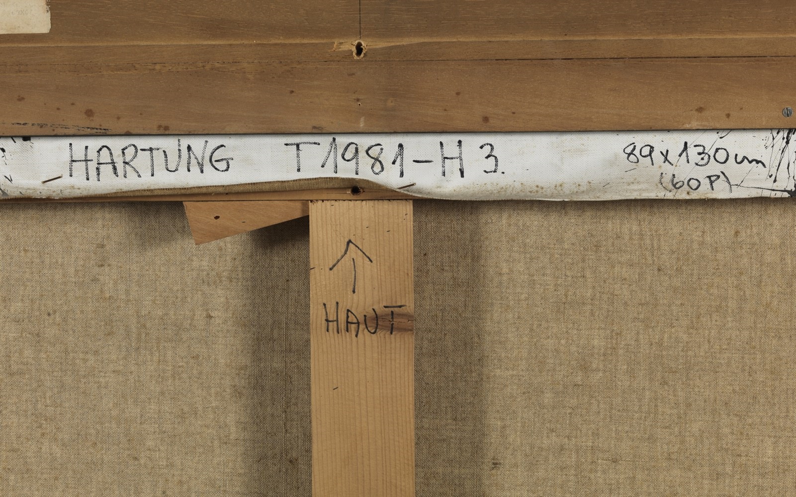 HARTUNG HANS (1904 - 1989) T1981-H3. 1981. Acrilico su tela. Cm 130,00 x 89,00. Al retro firma e anno. Opera archiviata presso la Fondazione Hans Hartung, Antibes, come da documentazione fotografica allegata all'opera riportante il relativo numero d'inventario. Provenienza: Collezione privata, Cannes, acquistato direttamente dall'artista. Cornice presente