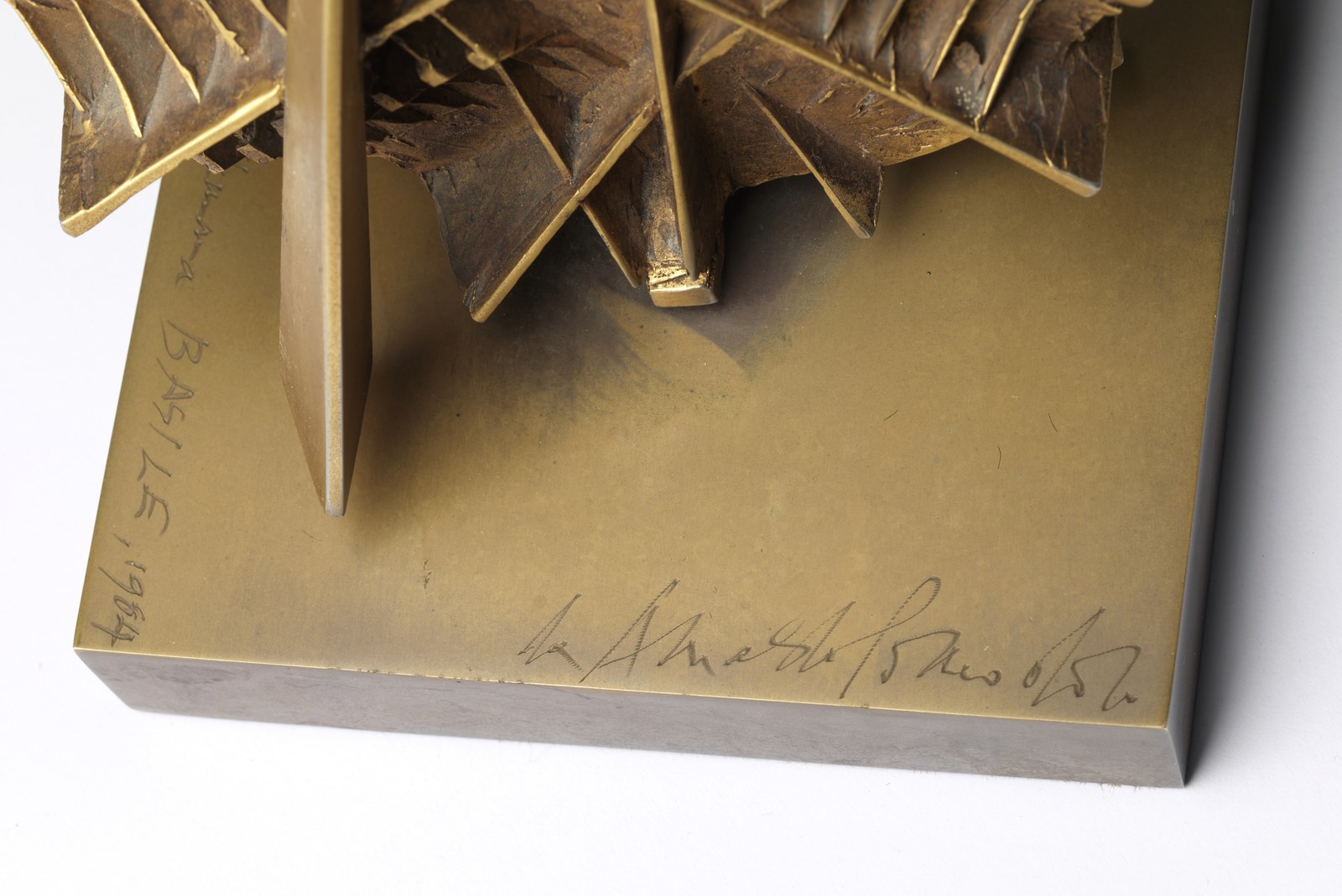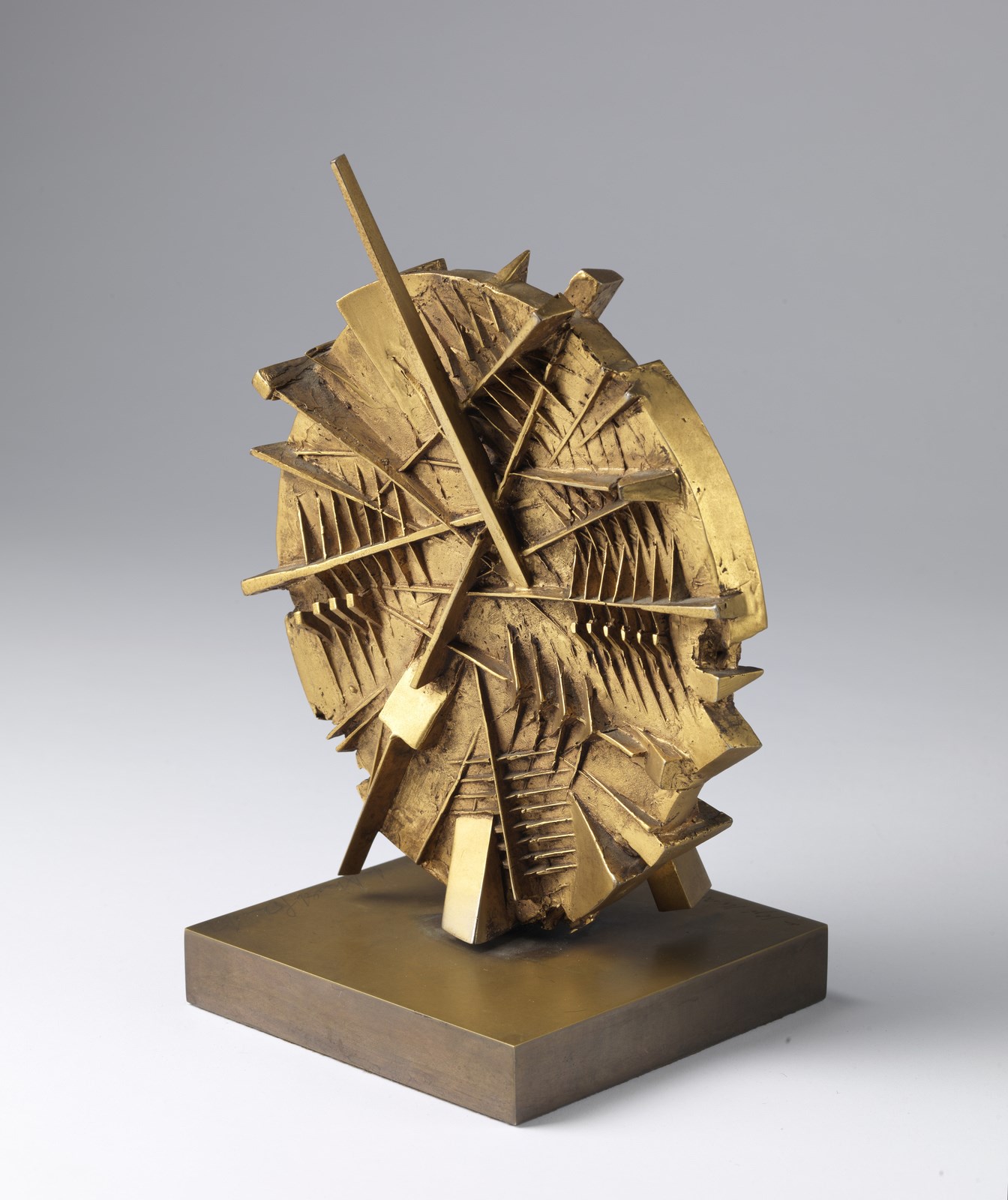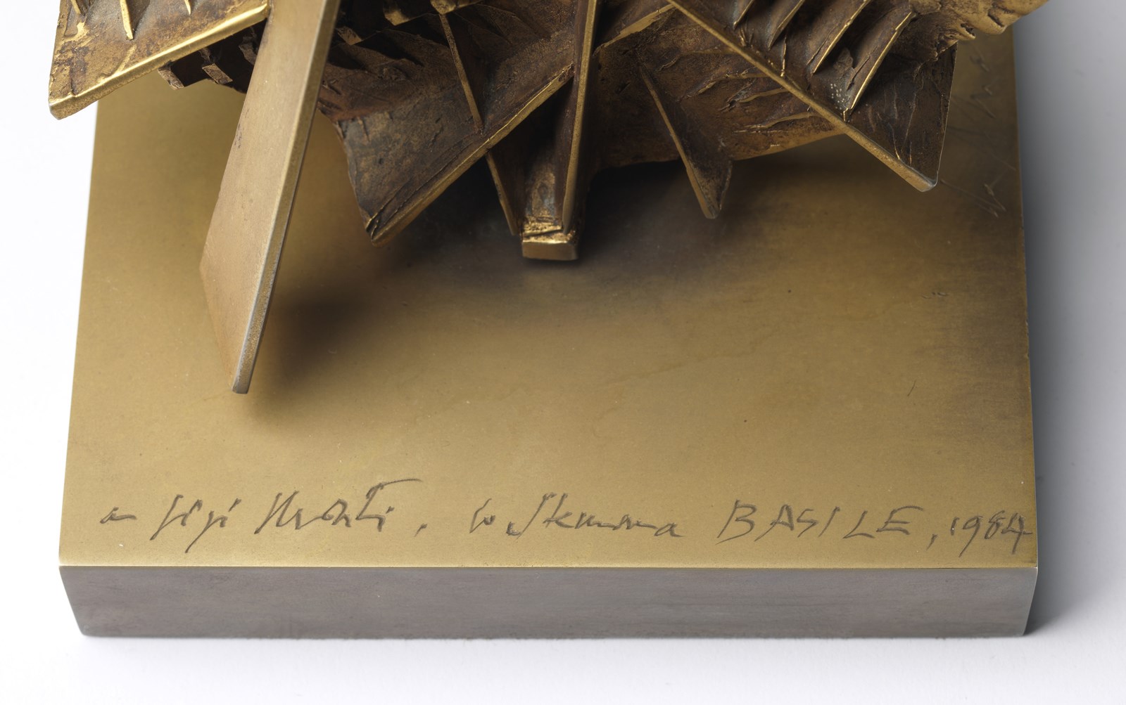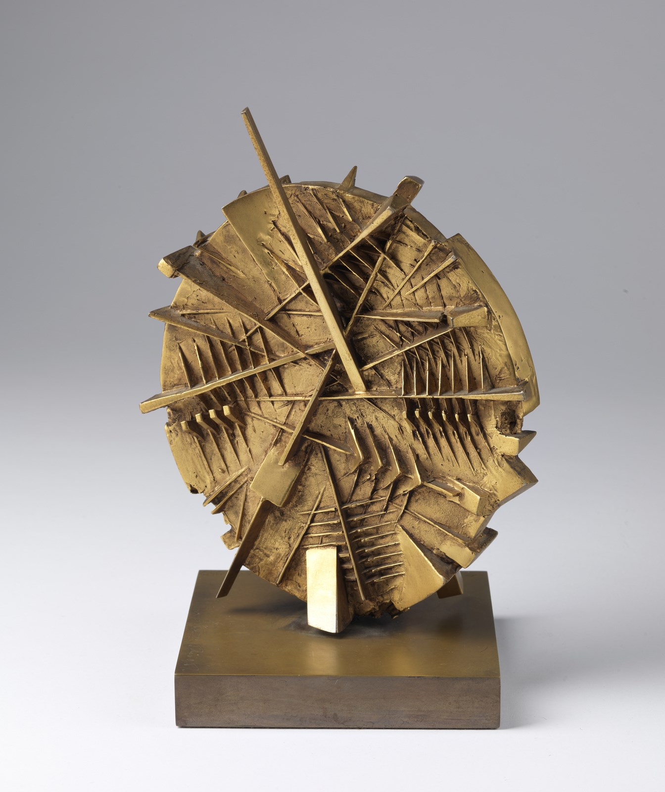 POMODORO ARNALDO (n. 1926) Disco pulsante, studio. 1984. Bronzo. Cm 16,00 x 16,00 x 3,00. Firma e dedica incise alla base. Edizione totale: 9 esemplari + 3 prove d'artista. Pubblicazione: Arnaldo Pomodoro. Catalogo ragionato della scultura, a cura di F. Gualdoni, Skira editore, Milano, 2007. Catalogne Raisonnè online di Arnaldo Pomodoro con il numero 744.