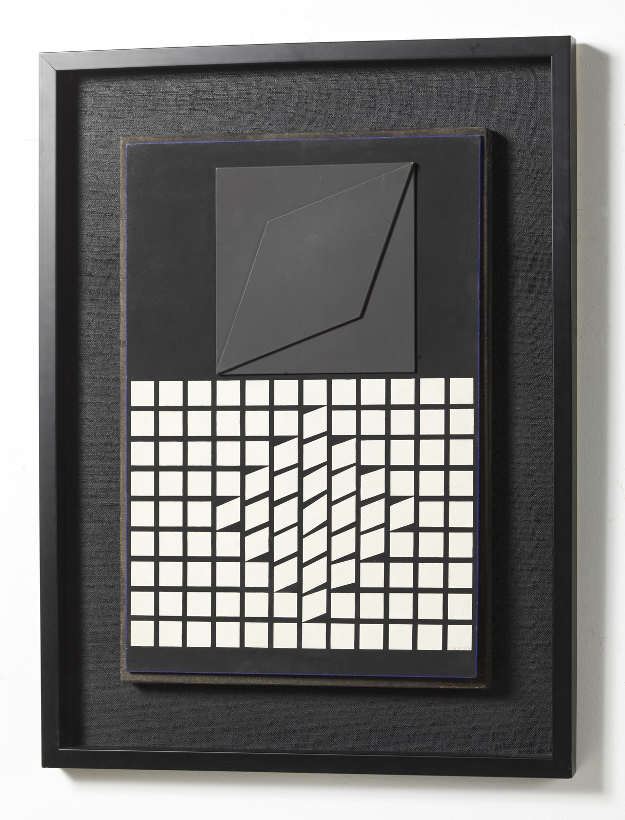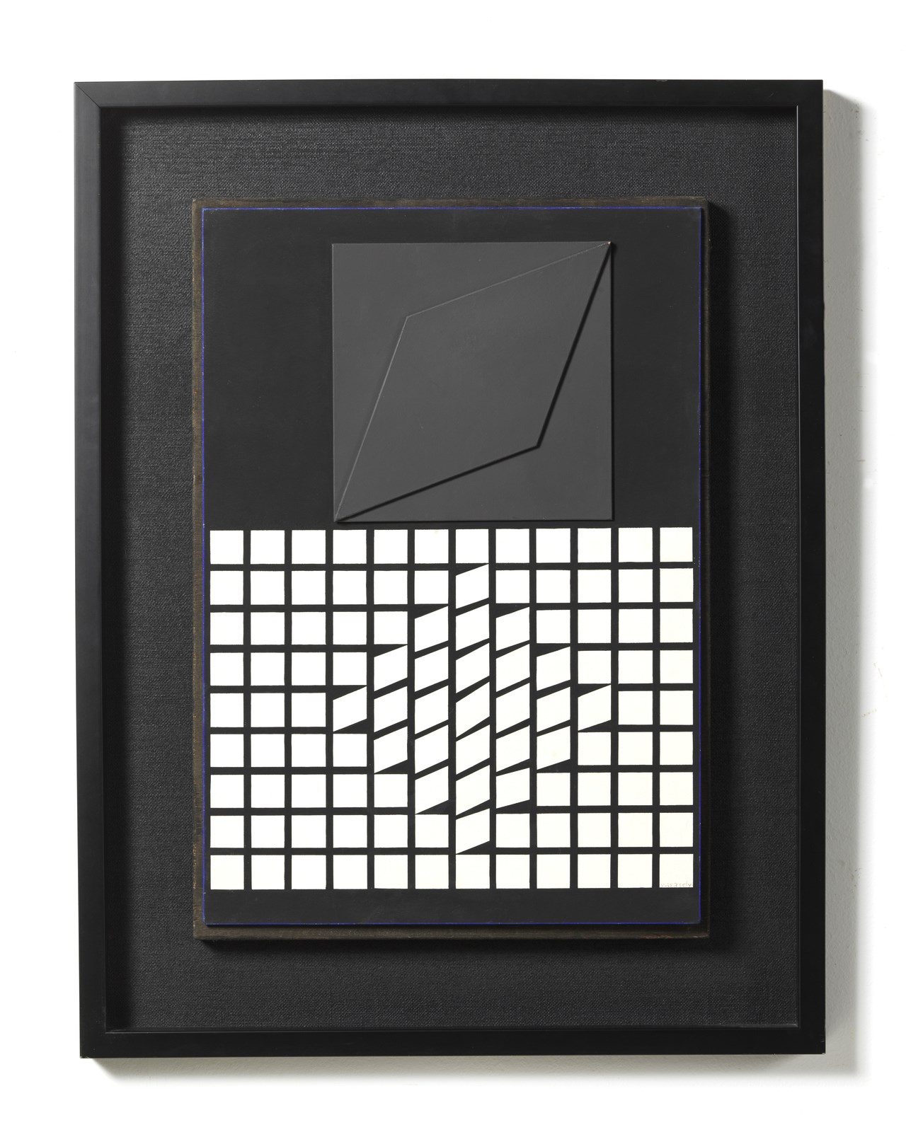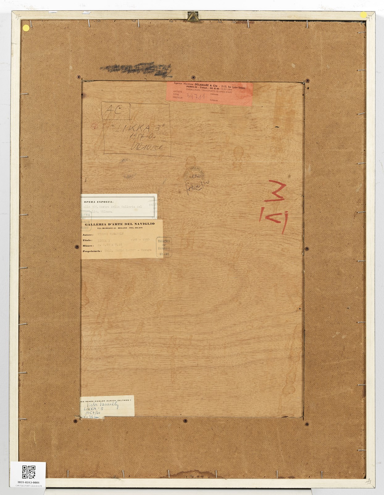 VASARELY VICTOR (1906 - 1997) Likka -3. Tecnica mista su tavola. Cm 38,00 x 55,00. 1957-1960. Firma in basso a destra. Al retro titolo, firma, anno, cartiglio descrittivo della Galleria d'arte del Naviglio, Milano e cartiglio della Galerie Renée Ziegler, Zurigo. Provenienza: Collezione Paolo Barbé, Novara; Galleria del Naviglio, Milano; Galerie Renée Ziegler, Zurigo; Dorotheum, 2019; Collezione privata, Brescia. Esposizione: Milano, Galleria del Naviglio, Victor Vasarely, 409° Mostra del Naviglio, 3 – 19 ottobre 1964. L’opera sarà inclusa nel Catalogue raisonné de l’oeuvre peint de Victor Vasarely, attualmente in preparazione. . Cornice presente