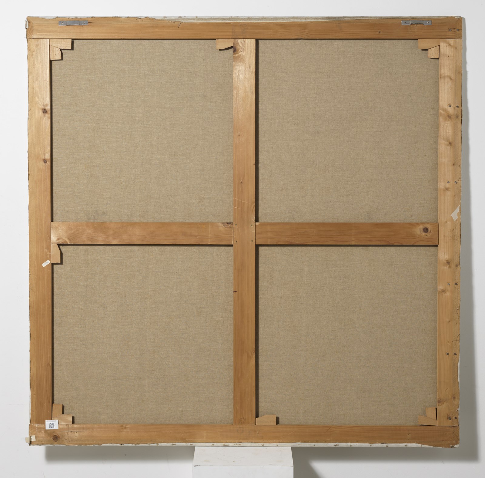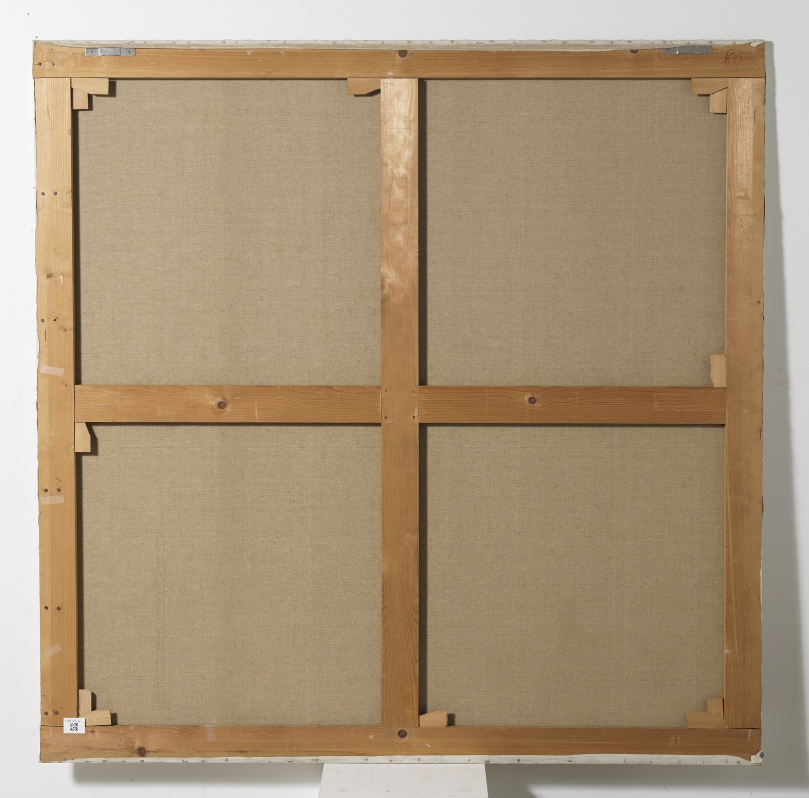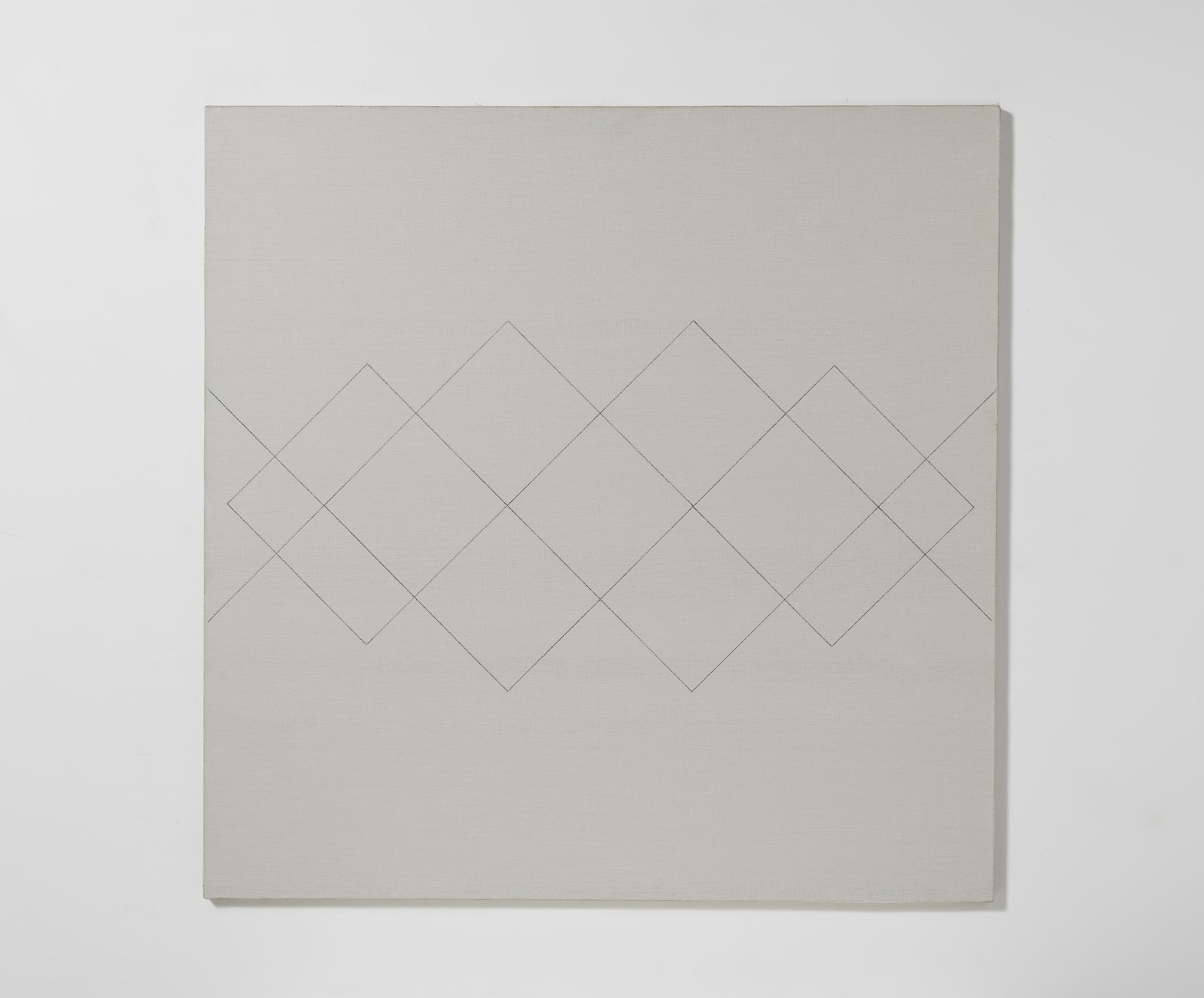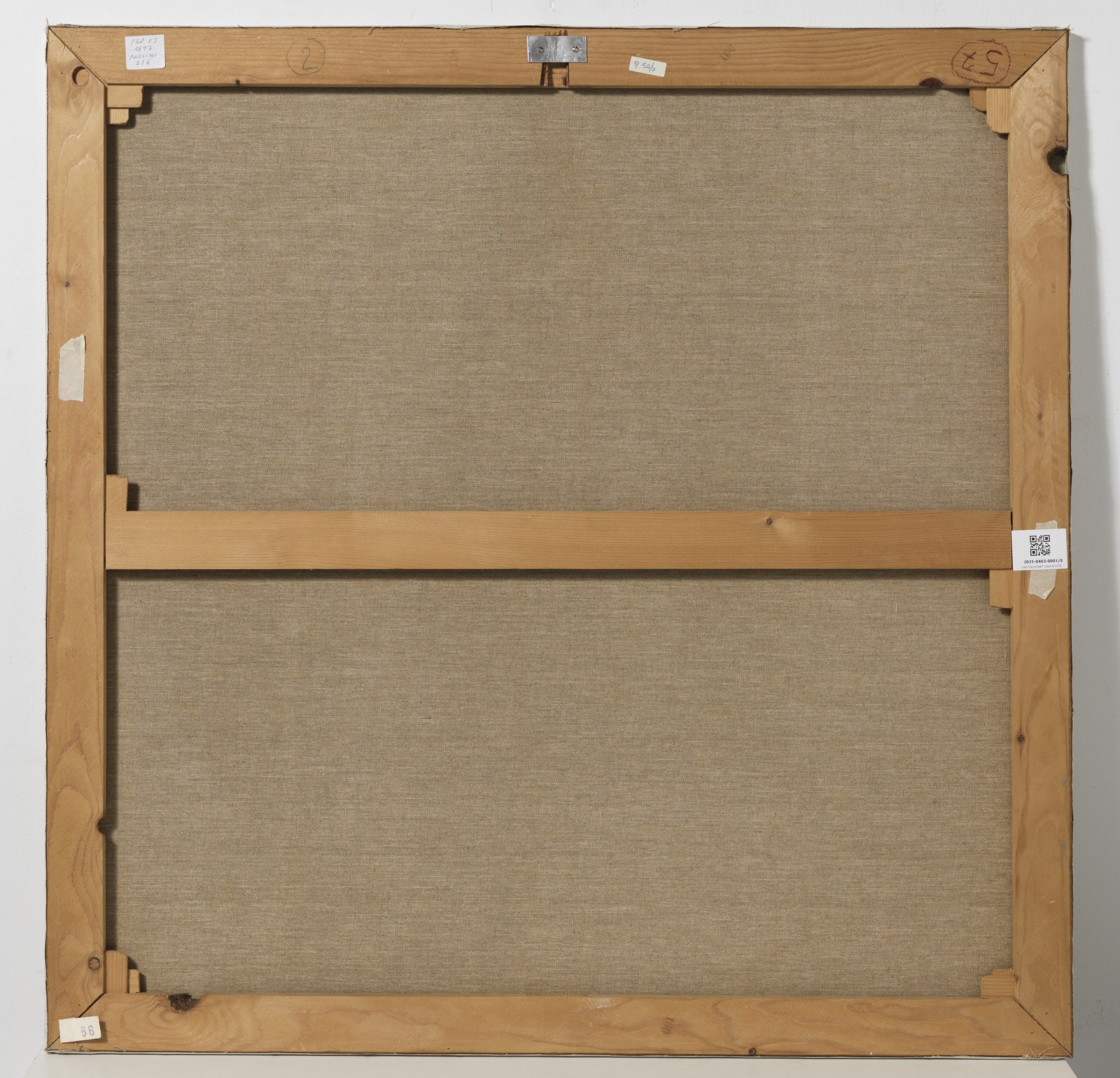 PAOLINI GIULIO (n. 1940) Liber Veritatis. . 1977. Tecnica mista su tela. Cm 415,00 x 180,00. L'opera, concepita per l'atrio di casa Grimaldi, si sviluppa lungo tre pareti ed è costituita da otto tele bianche, indivisibili, con disegni geometrici in nero. Al retro di ogni tela, ad eccezione di quelle più grandi, è presente un progressivo da 1 a 6 a matita. Tela n.1: Composizione di quadrati dal contorno nero, 60.3x60.3x2 cm. Tela n.2: Composizione di rombi posizionati al centro, 100x100x2 cm. Tela n.3: Composizione di sei rombi che occupano l'intera superficie, 75x75x2 cm. Tela n.4: Composizione di sei quadrati disposti a piramide, 75x75x2 cm. Tela n.5: Composizione di sei quadrati disposti in cerchio, 100x100x2 cm. Tela n.6: Composizione di sei quadrati disposti a forma di rosa, 60x60x2 cm. Le ultime due tele, unite da un gancio sul retro, rappresentano l'interno di una stanza, 179x358x2 cm. Autentica dell'artista su fotografia. Pubblicazione: Giulio Paolini- Catalogo ragionato,Tomo I, opere 1960-1982, a cura di Maddalena Disch, Skira Edizioni, 2008, pag.356-357, ill. 346. Provenienza: Collezione Grimaldi, Roma; Finarte, Roma, 1986; Collezione privata, Roma.