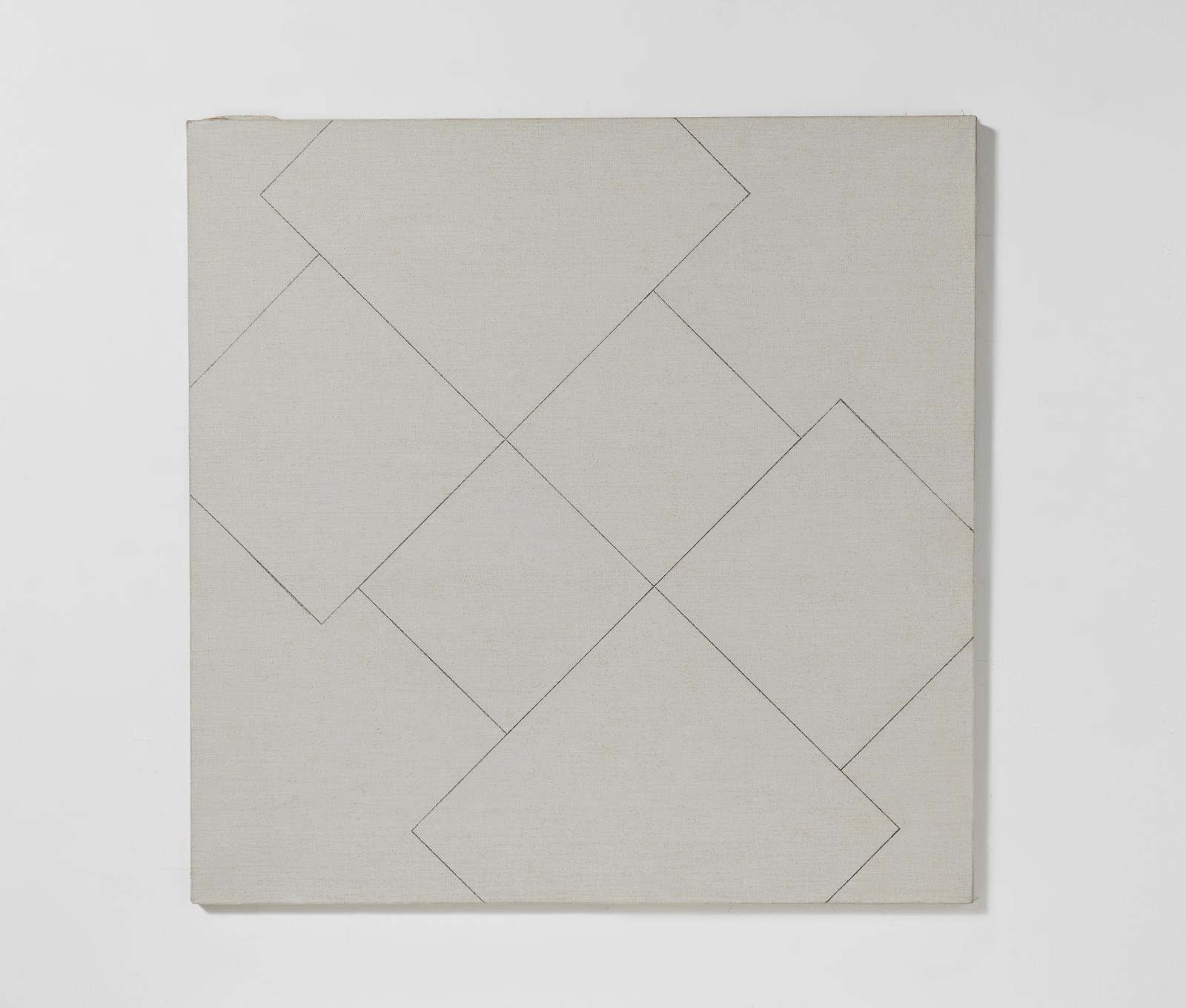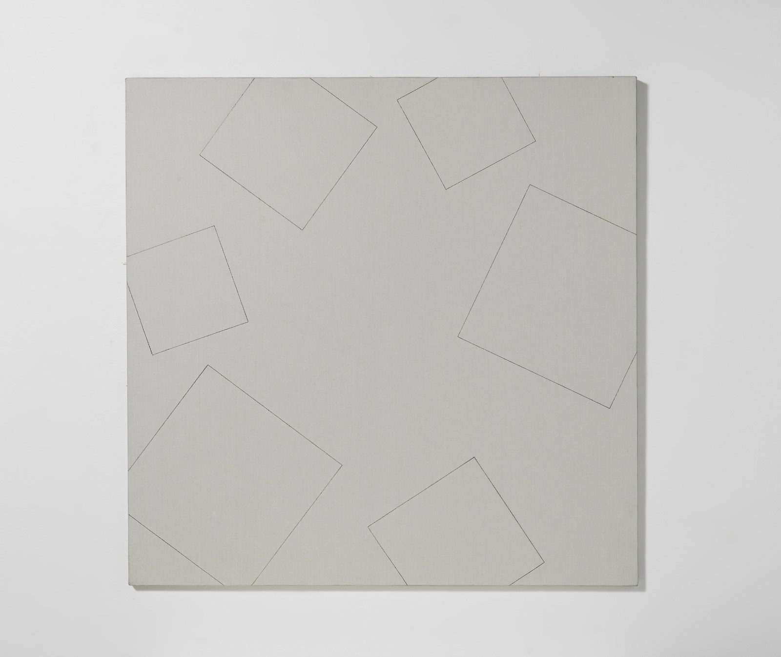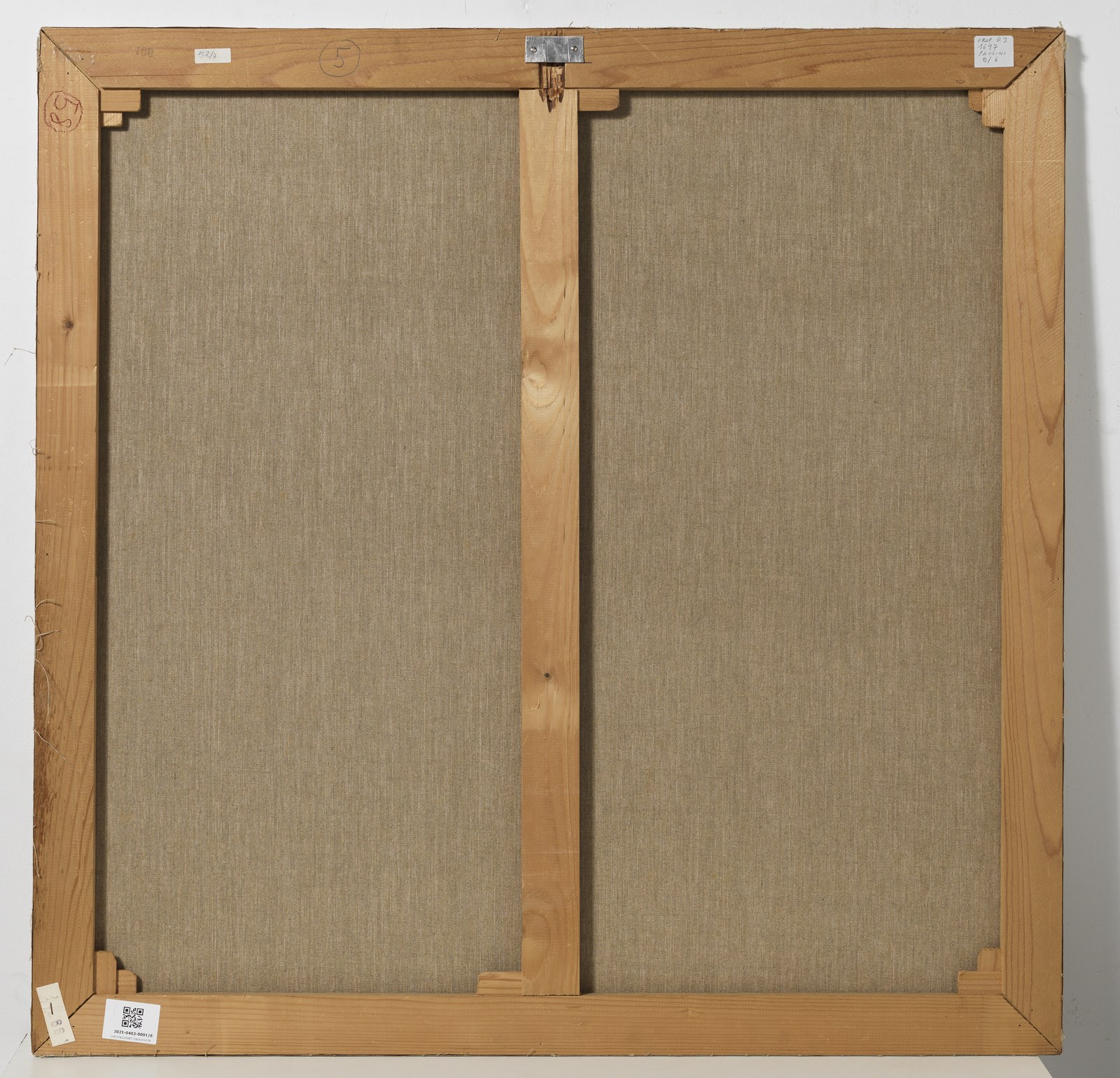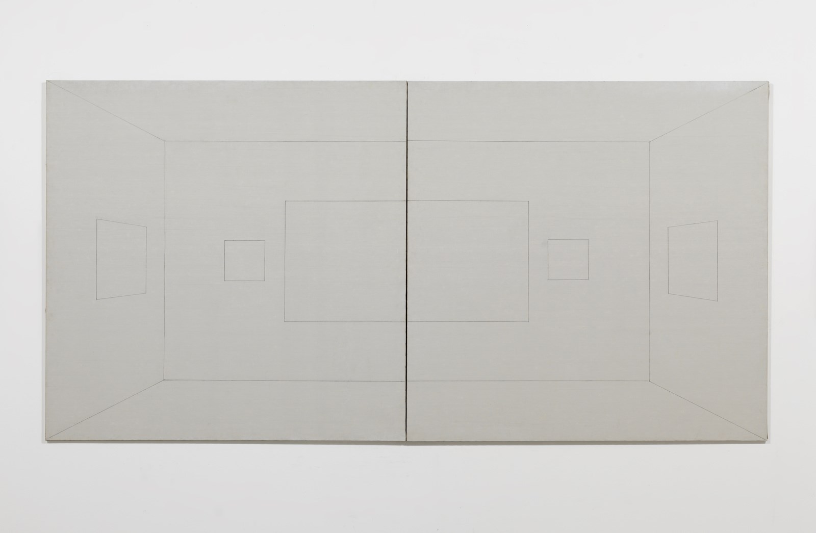 PAOLINI GIULIO (n. 1940) Liber Veritatis. . 1977. Tecnica mista su tela. Cm 415,00 x 180,00. L'opera, concepita per l'atrio di casa Grimaldi, si sviluppa lungo tre pareti ed è costituita da otto tele bianche, indivisibili, con disegni geometrici in nero. Al retro di ogni tela, ad eccezione di quelle più grandi, è presente un progressivo da 1 a 6 a matita. Tela n.1: Composizione di quadrati dal contorno nero, 60.3x60.3x2 cm. Tela n.2: Composizione di rombi posizionati al centro, 100x100x2 cm. Tela n.3: Composizione di sei rombi che occupano l'intera superficie, 75x75x2 cm. Tela n.4: Composizione di sei quadrati disposti a piramide, 75x75x2 cm. Tela n.5: Composizione di sei quadrati disposti in cerchio, 100x100x2 cm. Tela n.6: Composizione di sei quadrati disposti a forma di rosa, 60x60x2 cm. Le ultime due tele, unite da un gancio sul retro, rappresentano l'interno di una stanza, 179x358x2 cm. Autentica dell'artista su fotografia. Pubblicazione: Giulio Paolini- Catalogo ragionato,Tomo I, opere 1960-1982, a cura di Maddalena Disch, Skira Edizioni, 2008, pag.356-357, ill. 346. Provenienza: Collezione Grimaldi, Roma; Finarte, Roma, 1986; Collezione privata, Roma.