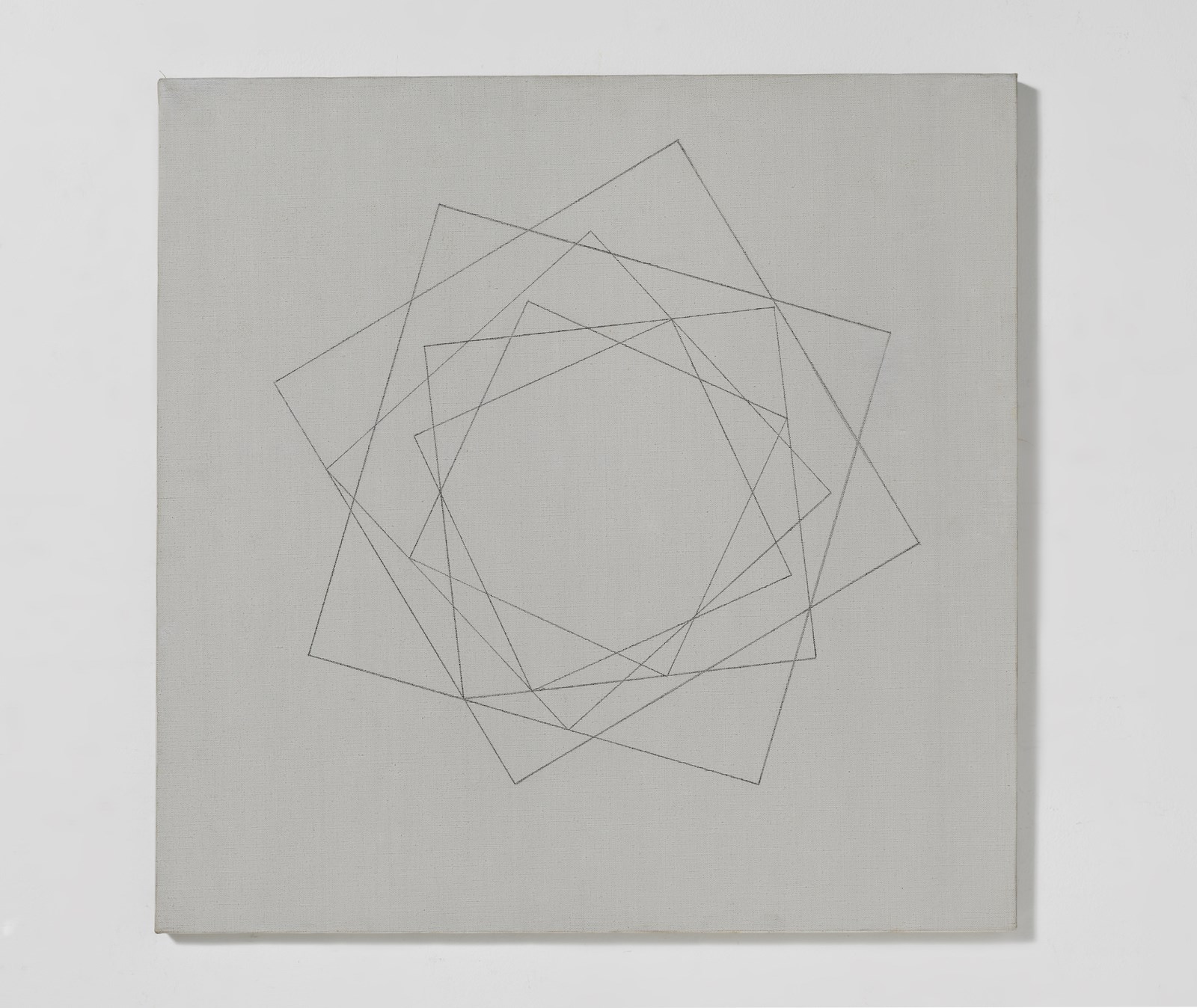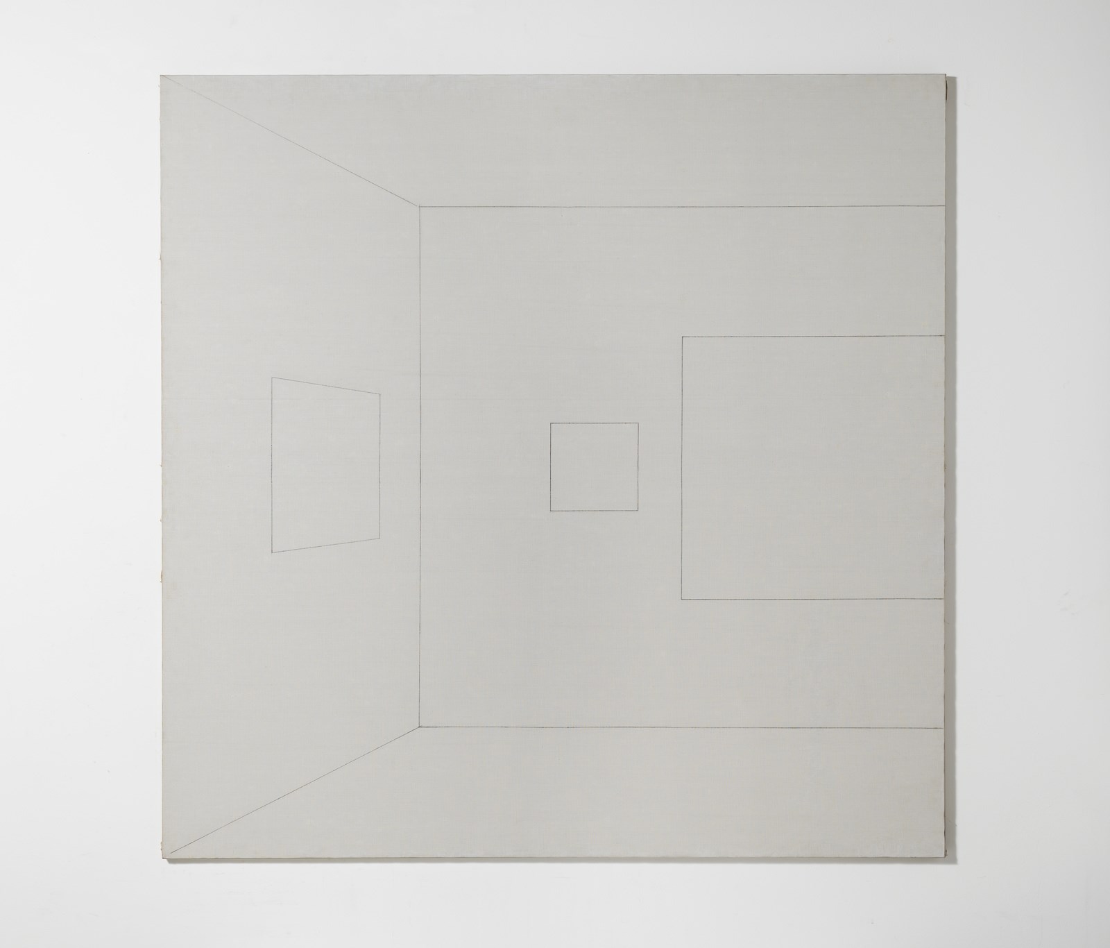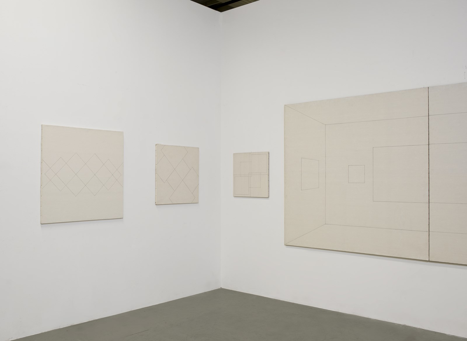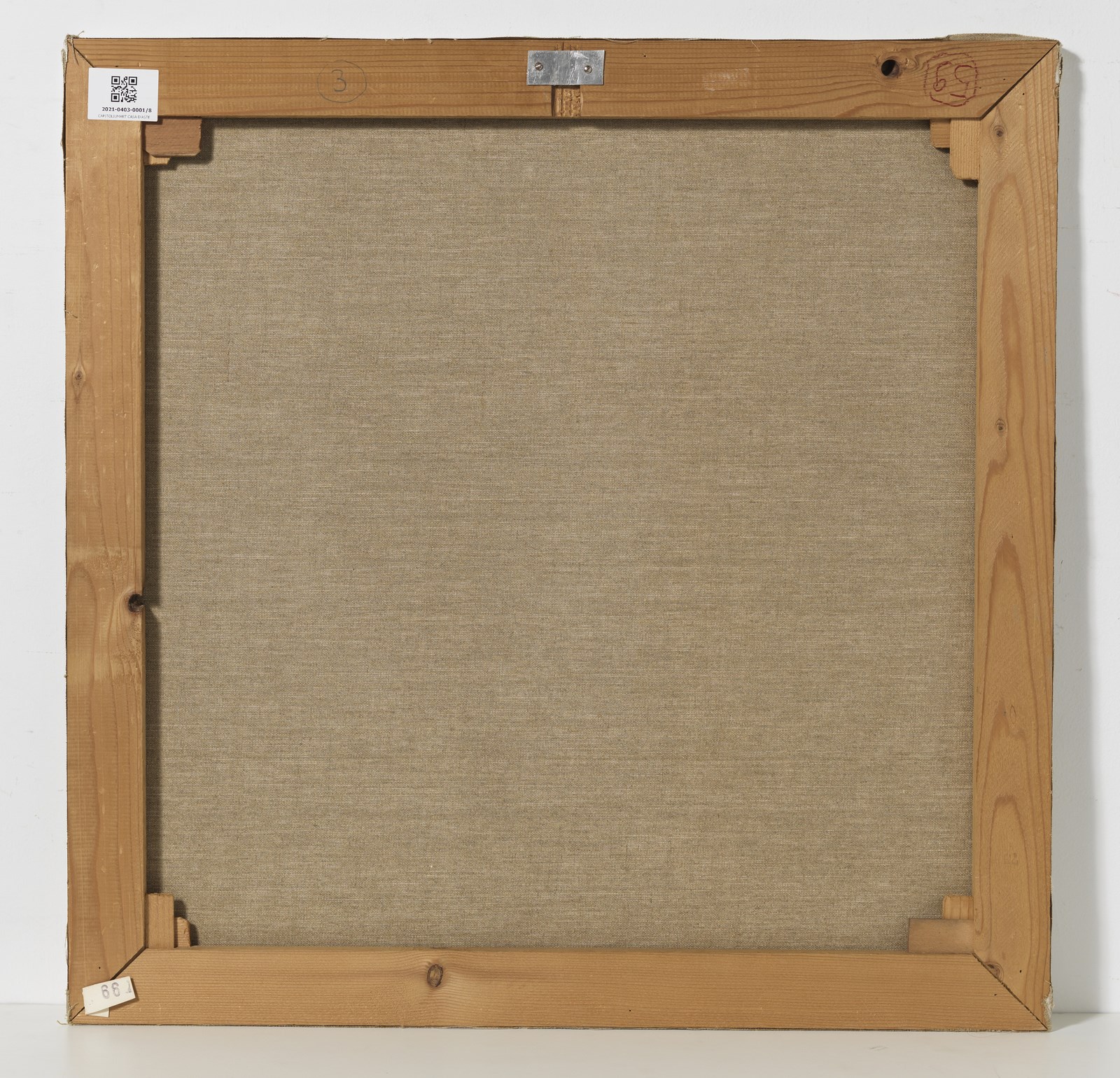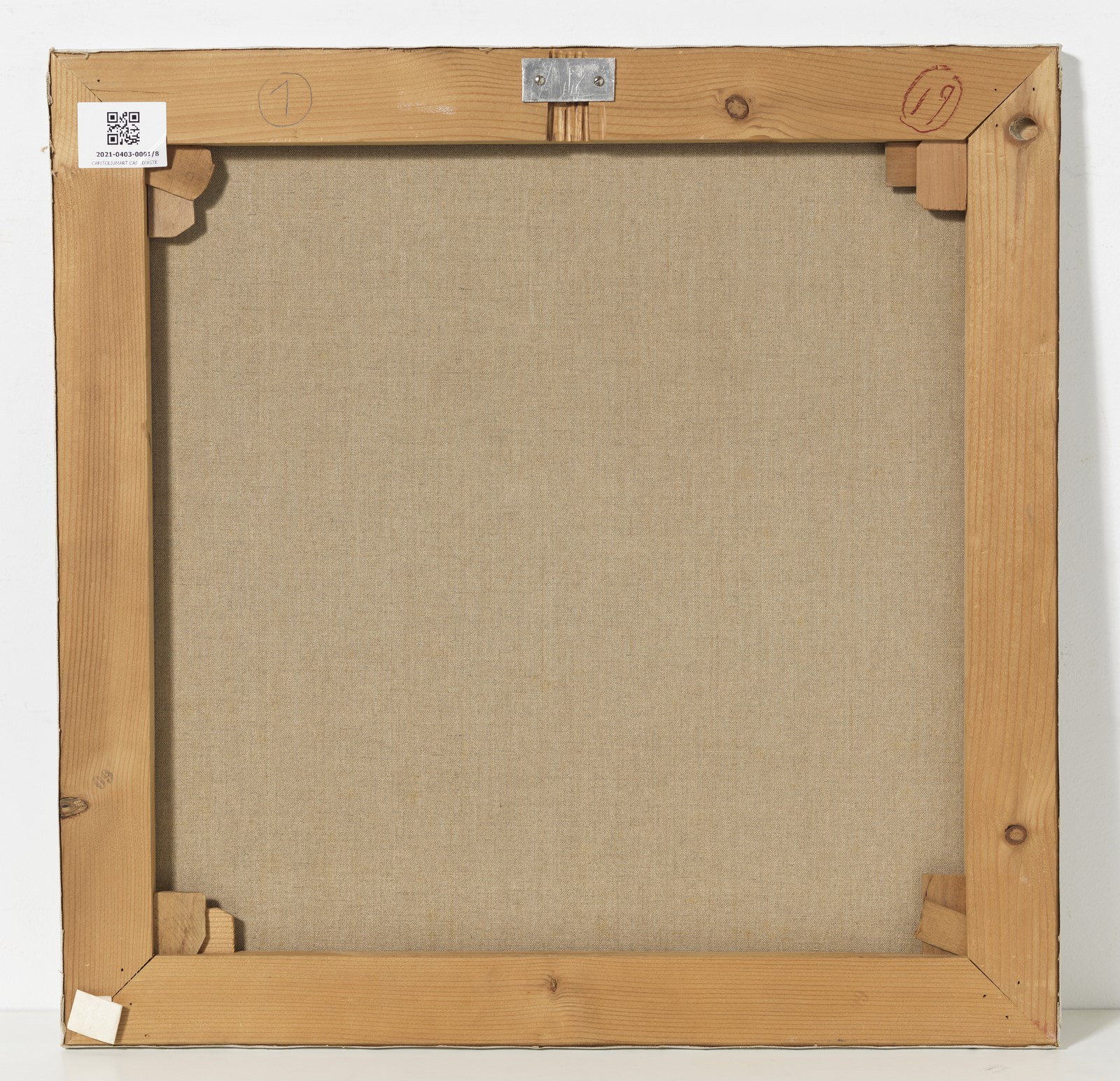 PAOLINI GIULIO (n. 1940) Liber Veritatis. . 1977. Tecnica mista su tela. Cm 415,00 x 180,00. L'opera, concepita per l'atrio di casa Grimaldi, si sviluppa lungo tre pareti ed è costituita da otto tele bianche, indivisibili, con disegni geometrici in nero. Al retro di ogni tela, ad eccezione di quelle più grandi, è presente un progressivo da 1 a 6 a matita. Tela n.1: Composizione di quadrati dal contorno nero, 60.3x60.3x2 cm. Tela n.2: Composizione di rombi posizionati al centro, 100x100x2 cm. Tela n.3: Composizione di sei rombi che occupano l'intera superficie, 75x75x2 cm. Tela n.4: Composizione di sei quadrati disposti a piramide, 75x75x2 cm. Tela n.5: Composizione di sei quadrati disposti in cerchio, 100x100x2 cm. Tela n.6: Composizione di sei quadrati disposti a forma di rosa, 60x60x2 cm. Le ultime due tele, unite da un gancio sul retro, rappresentano l'interno di una stanza, 179x358x2 cm. Autentica dell'artista su fotografia. Pubblicazione: Giulio Paolini- Catalogo ragionato,Tomo I, opere 1960-1982, a cura di Maddalena Disch, Skira Edizioni, 2008, pag.356-357, ill. 346. Provenienza: Collezione Grimaldi, Roma; Finarte, Roma, 1986; Collezione privata, Roma.