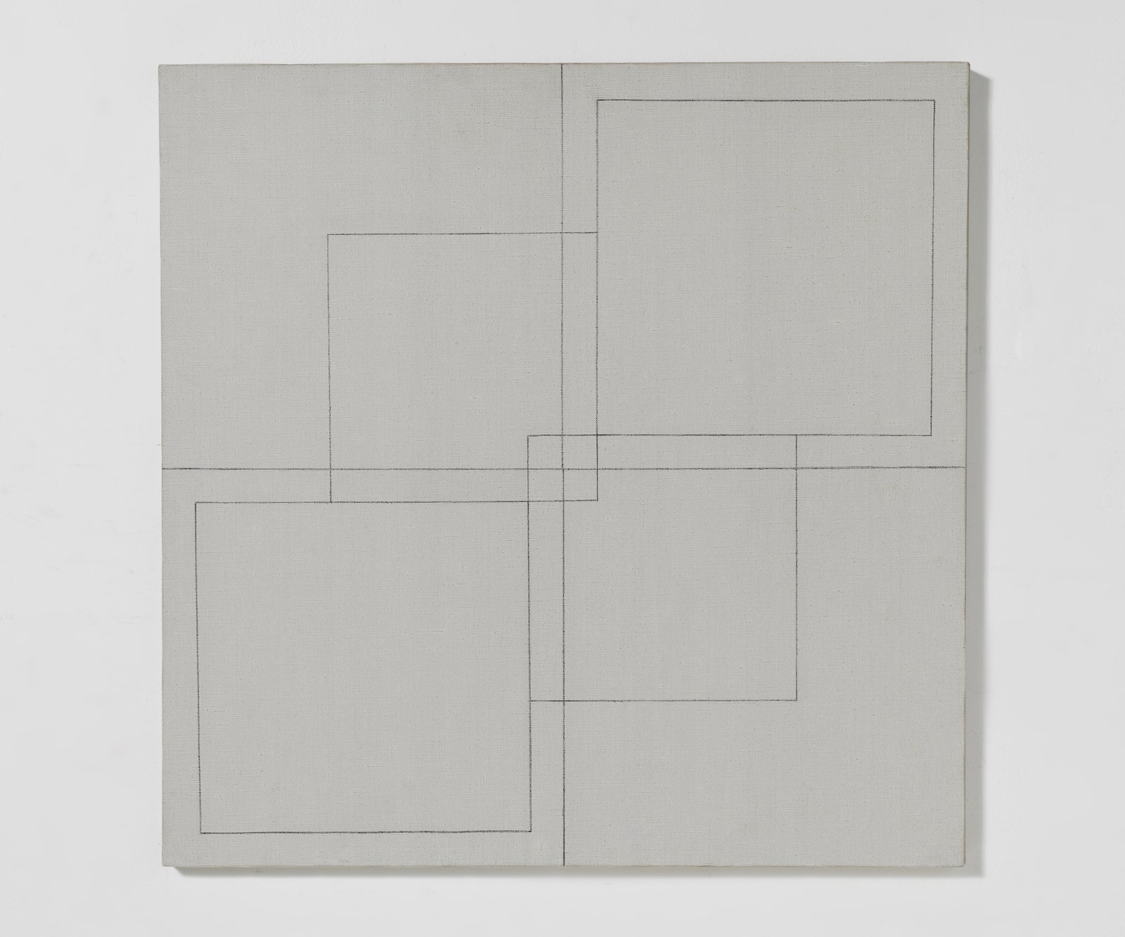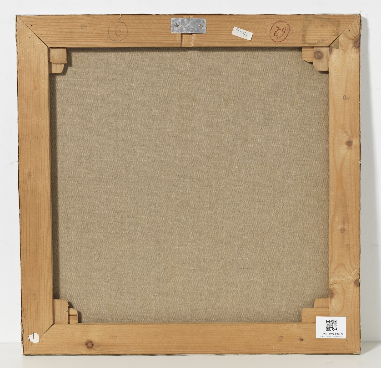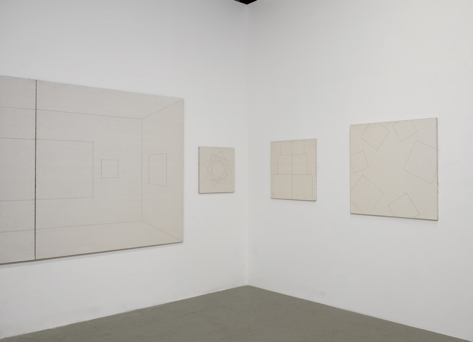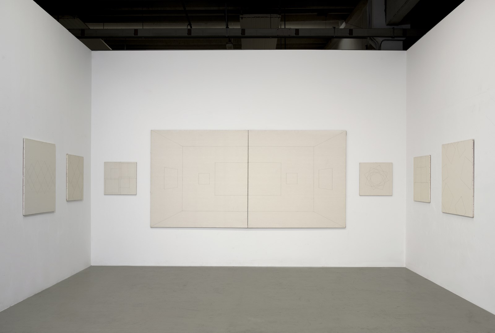 PAOLINI GIULIO (n. 1940) Liber Veritatis. . 1977. Tecnica mista su tela. Cm 415,00 x 180,00. L'opera, concepita per l'atrio di casa Grimaldi, si sviluppa lungo tre pareti ed è costituita da otto tele bianche, indivisibili, con disegni geometrici in nero. Al retro di ogni tela, ad eccezione di quelle più grandi, è presente un progressivo da 1 a 6 a matita. Tela n.1: Composizione di quadrati dal contorno nero, 60.3x60.3x2 cm. Tela n.2: Composizione di rombi posizionati al centro, 100x100x2 cm. Tela n.3: Composizione di sei rombi che occupano l'intera superficie, 75x75x2 cm. Tela n.4: Composizione di sei quadrati disposti a piramide, 75x75x2 cm. Tela n.5: Composizione di sei quadrati disposti in cerchio, 100x100x2 cm. Tela n.6: Composizione di sei quadrati disposti a forma di rosa, 60x60x2 cm. Le ultime due tele, unite da un gancio sul retro, rappresentano l'interno di una stanza, 179x358x2 cm. Autentica dell'artista su fotografia. Pubblicazione: Giulio Paolini- Catalogo ragionato,Tomo I, opere 1960-1982, a cura di Maddalena Disch, Skira Edizioni, 2008, pag.356-357, ill. 346. Provenienza: Collezione Grimaldi, Roma; Finarte, Roma, 1986; Collezione privata, Roma.