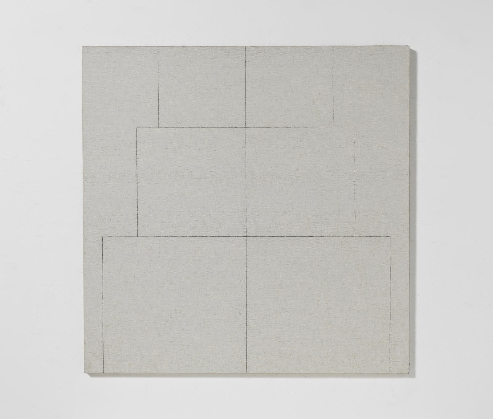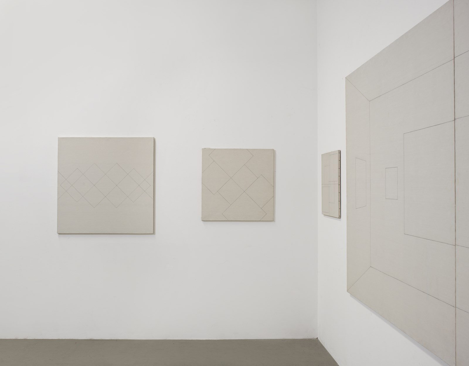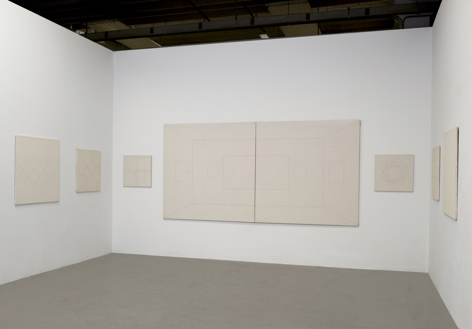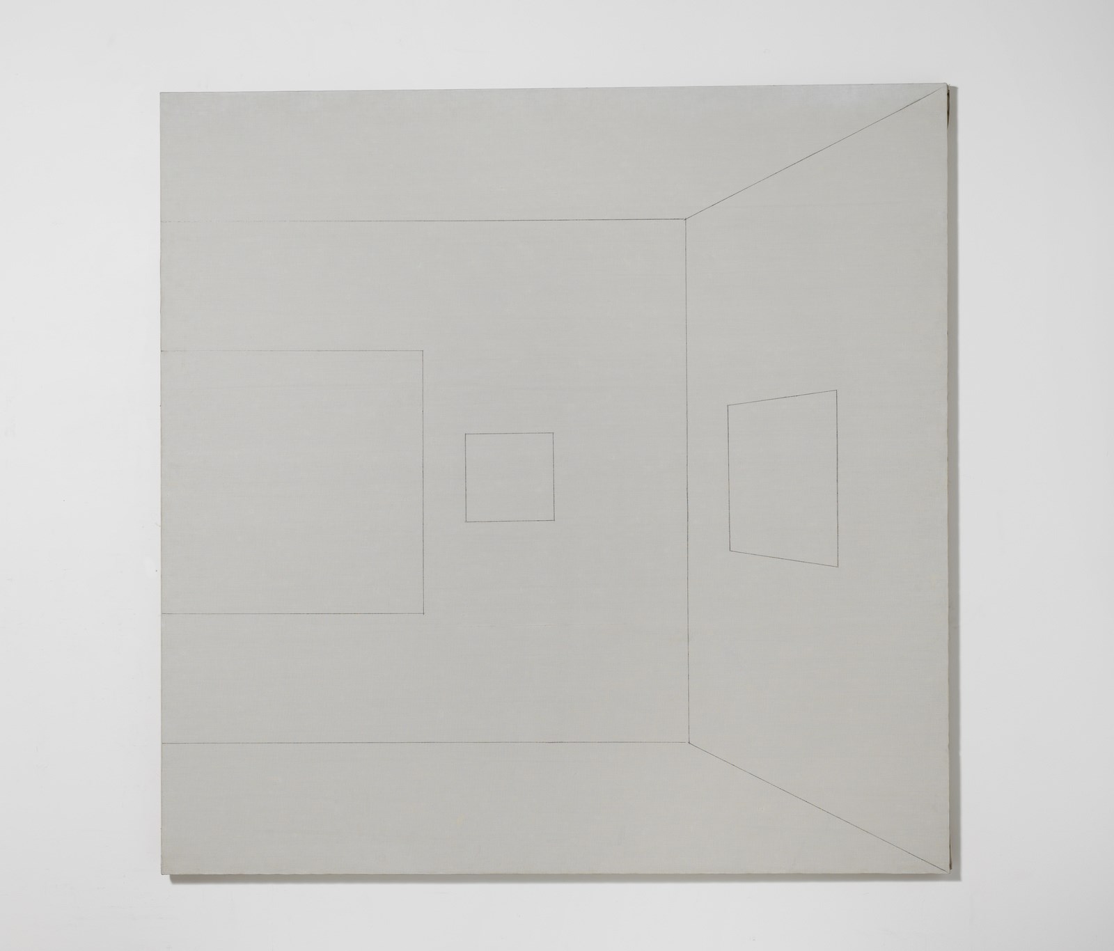 PAOLINI GIULIO (n. 1940) Liber Veritatis. . 1977. Tecnica mista su tela. Cm 415,00 x 180,00. L'opera, concepita per l'atrio di casa Grimaldi, si sviluppa lungo tre pareti ed è costituita da otto tele bianche, indivisibili, con disegni geometrici in nero. Al retro di ogni tela, ad eccezione di quelle più grandi, è presente un progressivo da 1 a 6 a matita. Tela n.1: Composizione di quadrati dal contorno nero, 60.3x60.3x2 cm. Tela n.2: Composizione di rombi posizionati al centro, 100x100x2 cm. Tela n.3: Composizione di sei rombi che occupano l'intera superficie, 75x75x2 cm. Tela n.4: Composizione di sei quadrati disposti a piramide, 75x75x2 cm. Tela n.5: Composizione di sei quadrati disposti in cerchio, 100x100x2 cm. Tela n.6: Composizione di sei quadrati disposti a forma di rosa, 60x60x2 cm. Le ultime due tele, unite da un gancio sul retro, rappresentano l'interno di una stanza, 179x358x2 cm. Autentica dell'artista su fotografia. Pubblicazione: Giulio Paolini- Catalogo ragionato,Tomo I, opere 1960-1982, a cura di Maddalena Disch, Skira Edizioni, 2008, pag.356-357, ill. 346. Provenienza: Collezione Grimaldi, Roma; Finarte, Roma, 1986; Collezione privata, Roma.