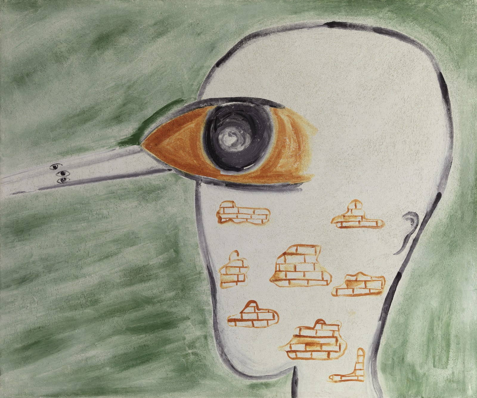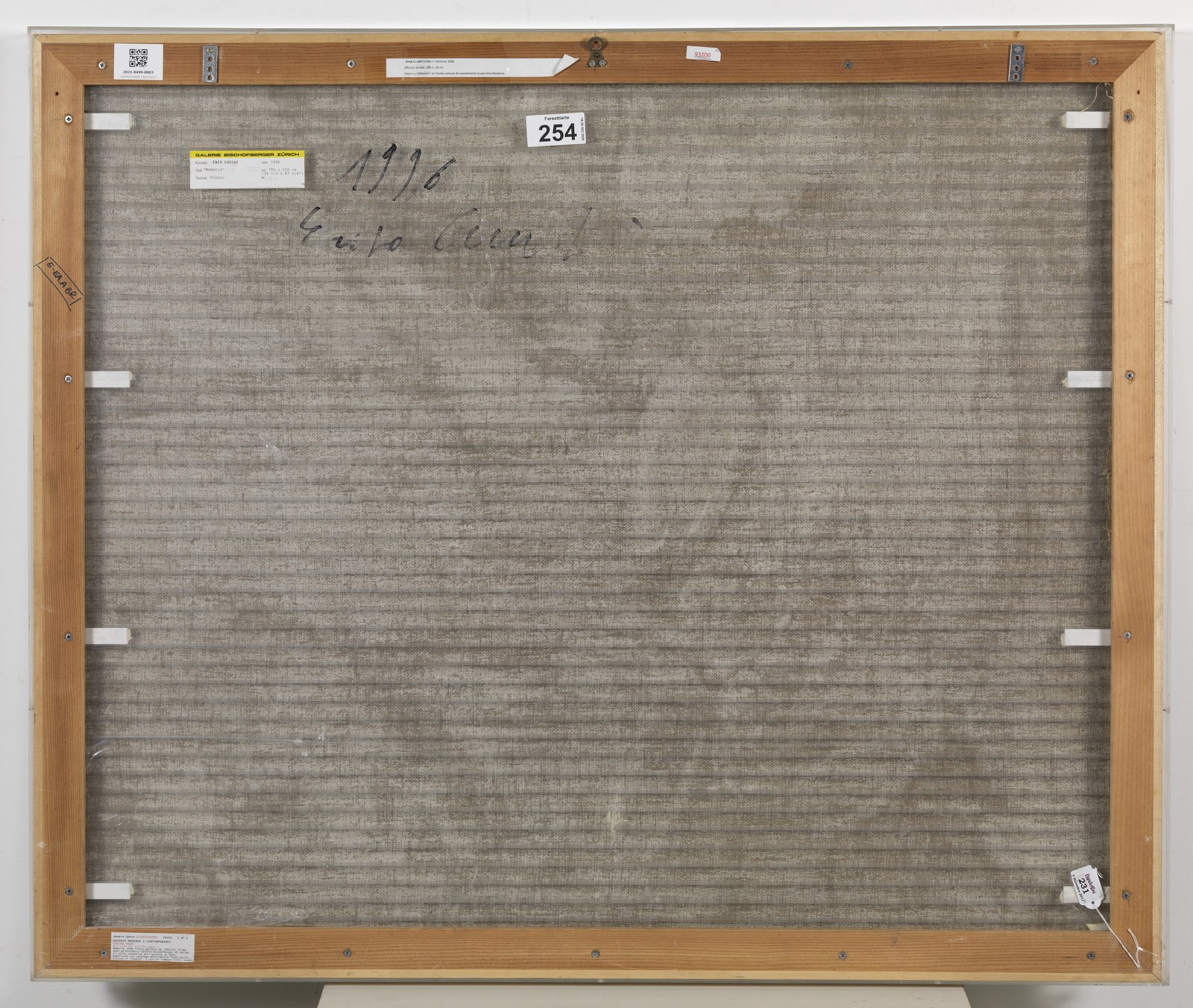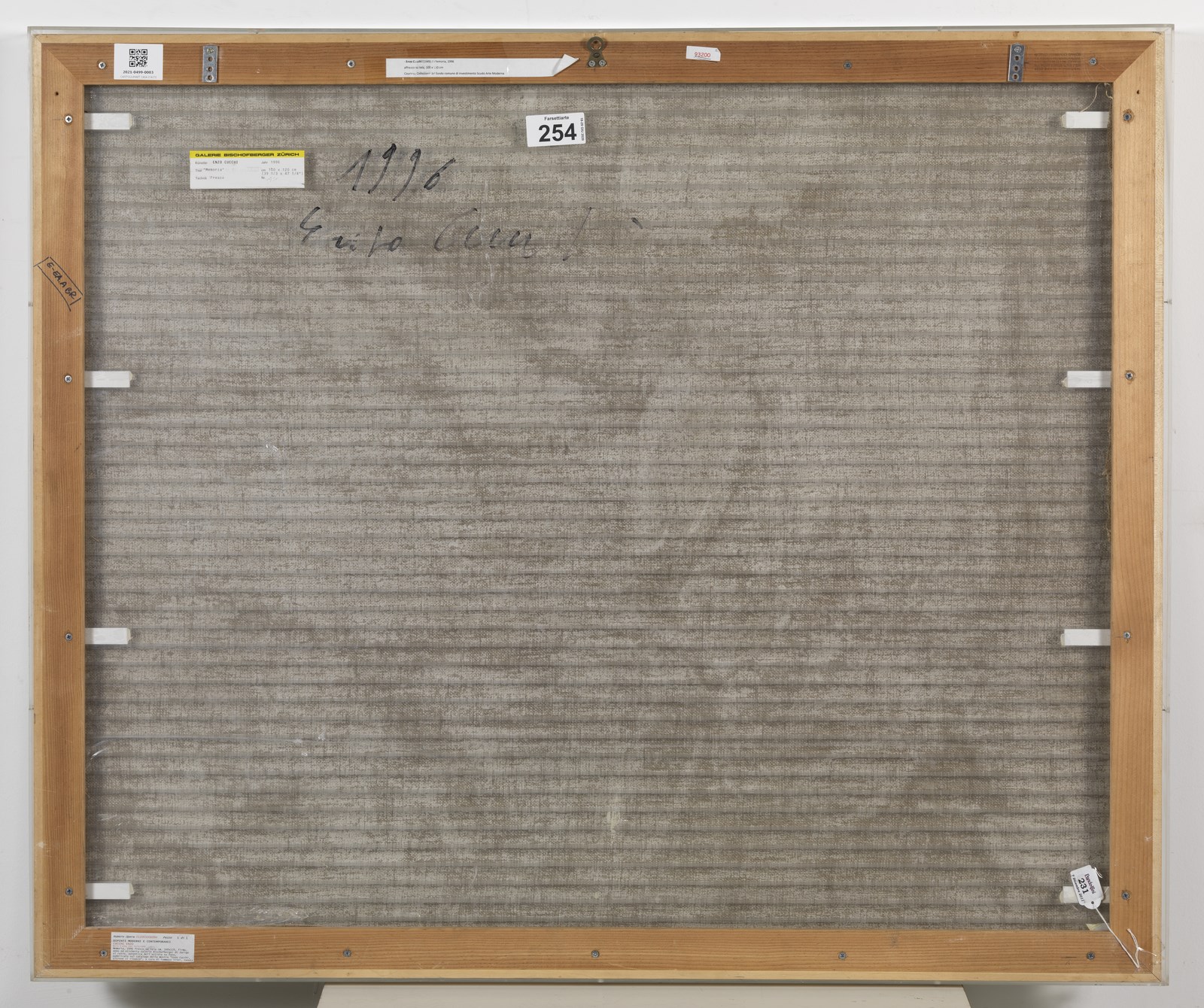 CUCCHI ENZO (n. 1949) Memoria. 1996. Affresco su tela. Cm 120,00 x 100,00. Al retro firma, anno e cartiglio descrittivo Galerie Bischofberger, Zurigo. Entro teca di plexiglass. Provenienza: Galleria Bischofberger, Zurigo; Collezione privata. Autentica dell'artista su fotografia. Esposizione: Enzo Cucchi. Altrove si rinasce, a cura di Tommaso Trini, Ozzano Monferrato, Borromini Arte Contemporanea, 5 Giugno - 24 Luglio 1999. Lotto con provenienza extra ue soggetto al 10% di tasse sull'importazione da aggiungere alle commissioni dell'acquirente. Cornice presente