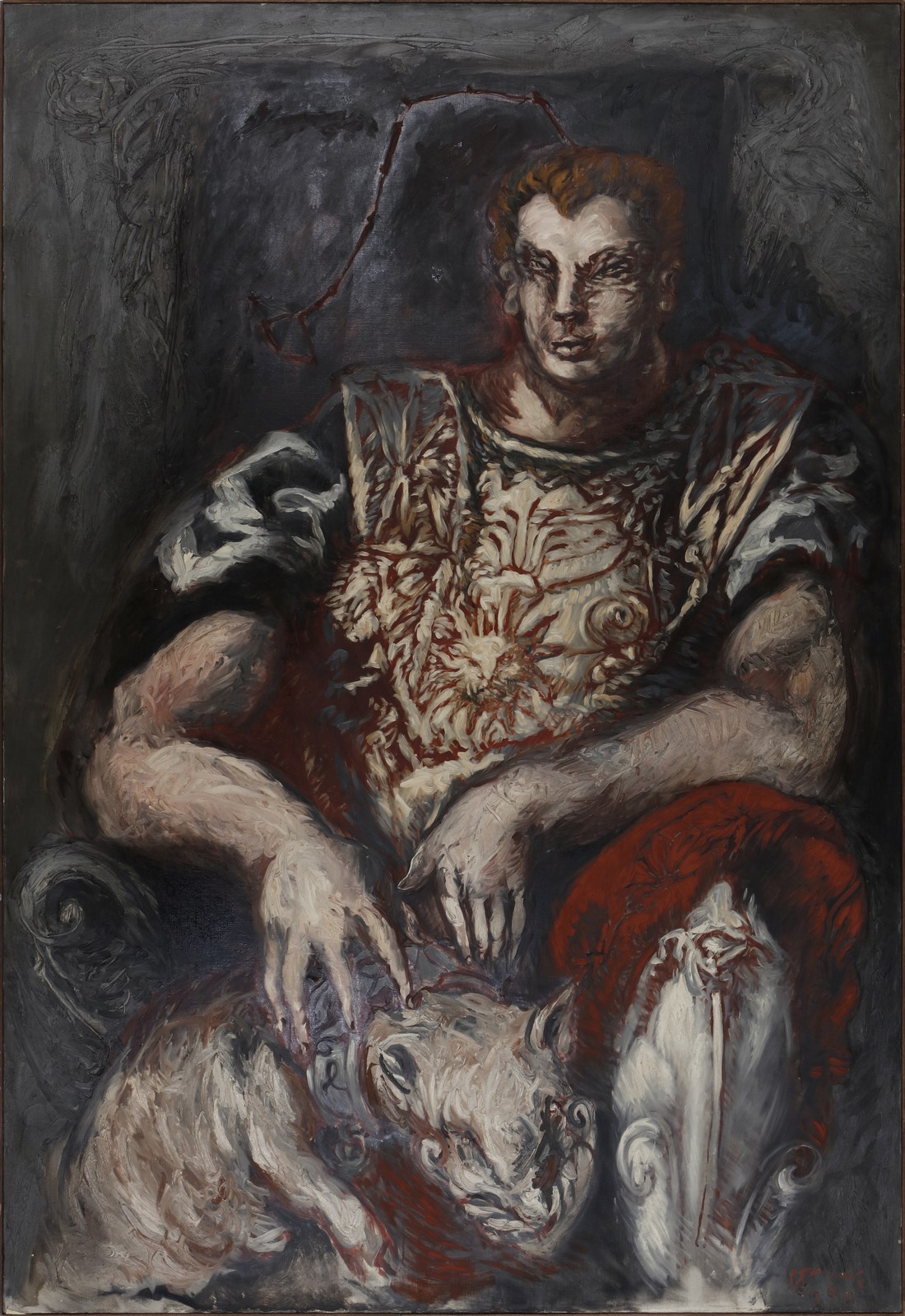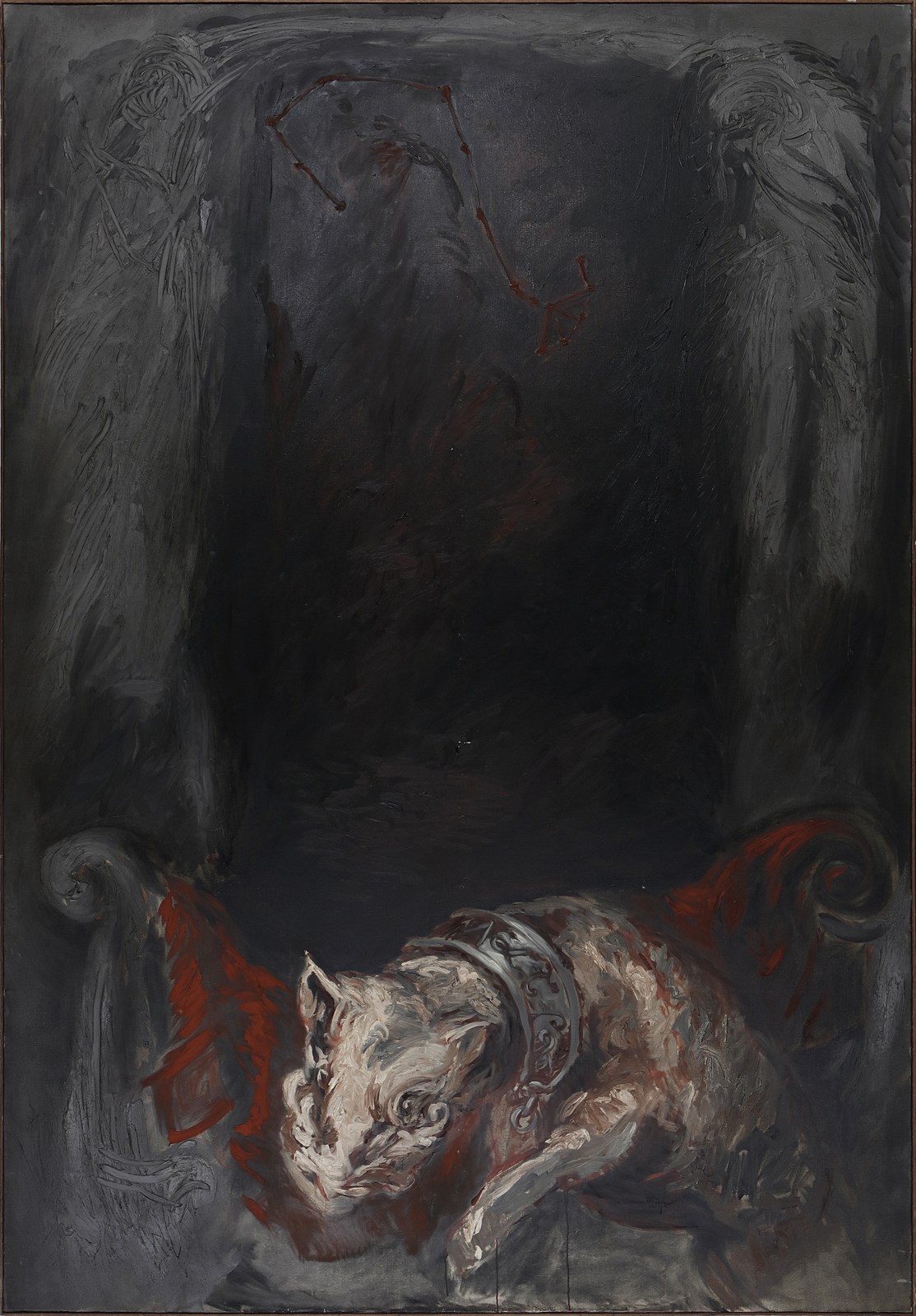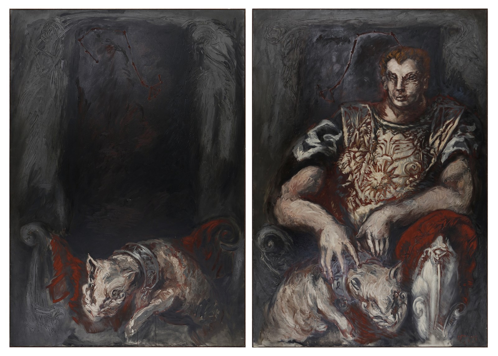 GAROUSTE GERARD (n. 1946) Orion, Maera et le miroir. 1984. Olio su tela . Cm 340,00 x 240,00. L'opera è composta da due tele. Firma in basso a destra. Al retro cartiglio Johsef Roggerdont. Cartiglio della XIII Biennale di Parigi, 1985. Esposizioni: XIII Biennale di Parigi, dal 2 Ottobre al 10 Novembre 1985, la Grande Halle de La Villette; Gerard Garouste a cura di Cleto Polcina, Galleria Due Ci, Roma, 1984. Provenienza: Galleria Due Ci, Roma; Collezione privata, Roma.