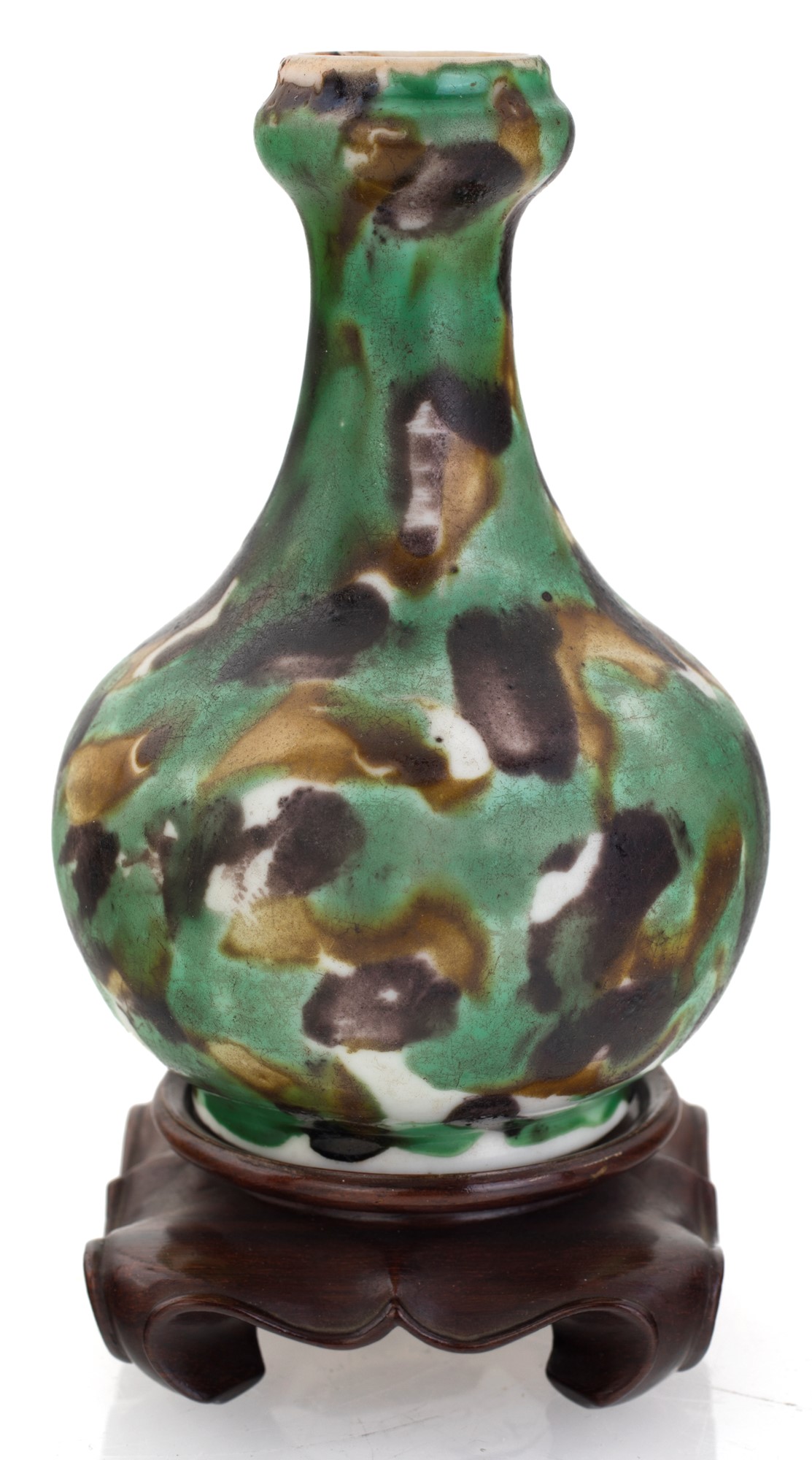 Piccolo vaso in ceramica smaltata, Cina a forma di balaustro con decorazione a macchie brune su fondo verde; base in legno, altezza complessiva cm 13