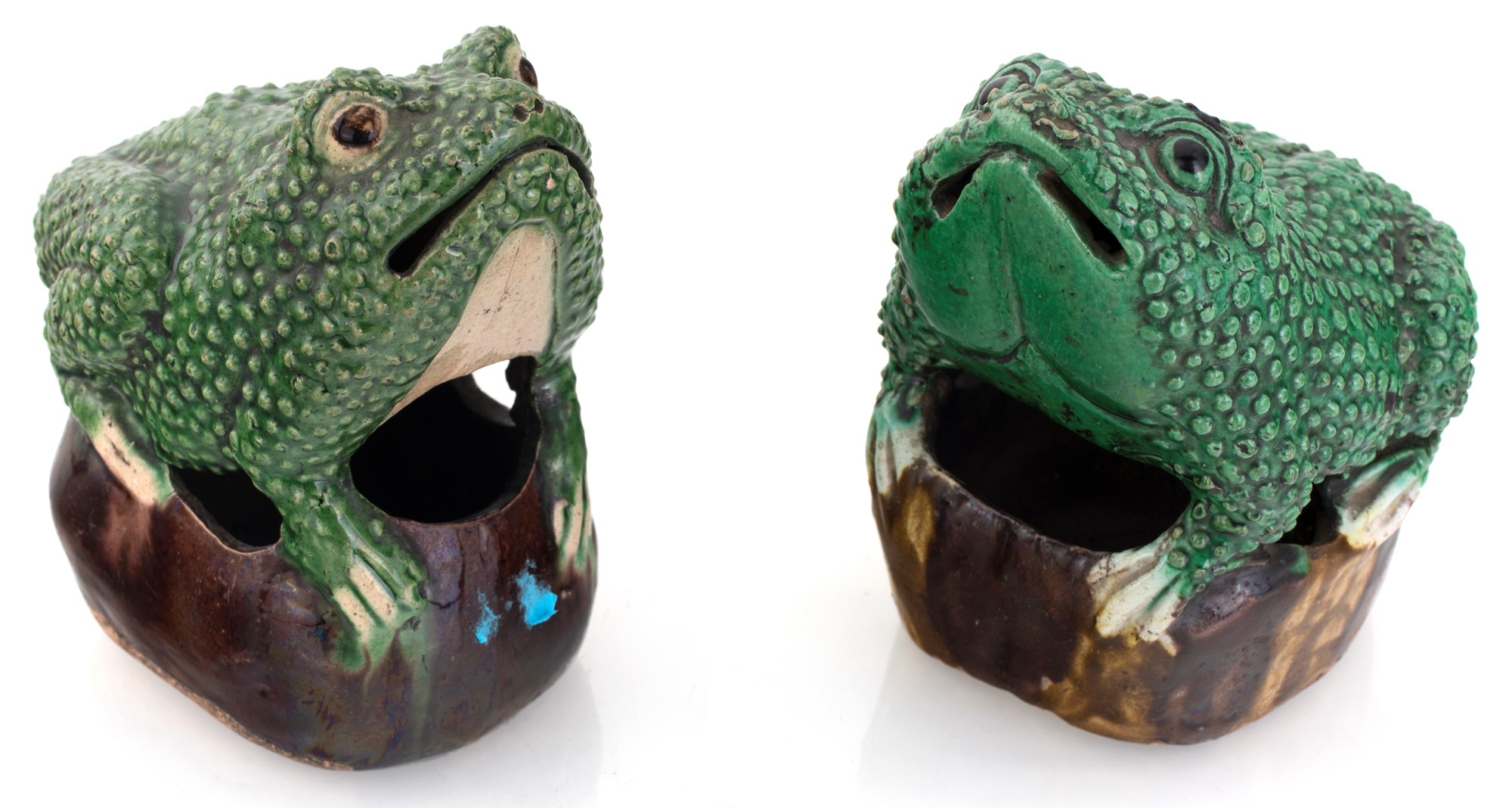 Coppia di rane in ceramica smaltata a tre colori, Cina, XX secolo , 12x12x8