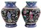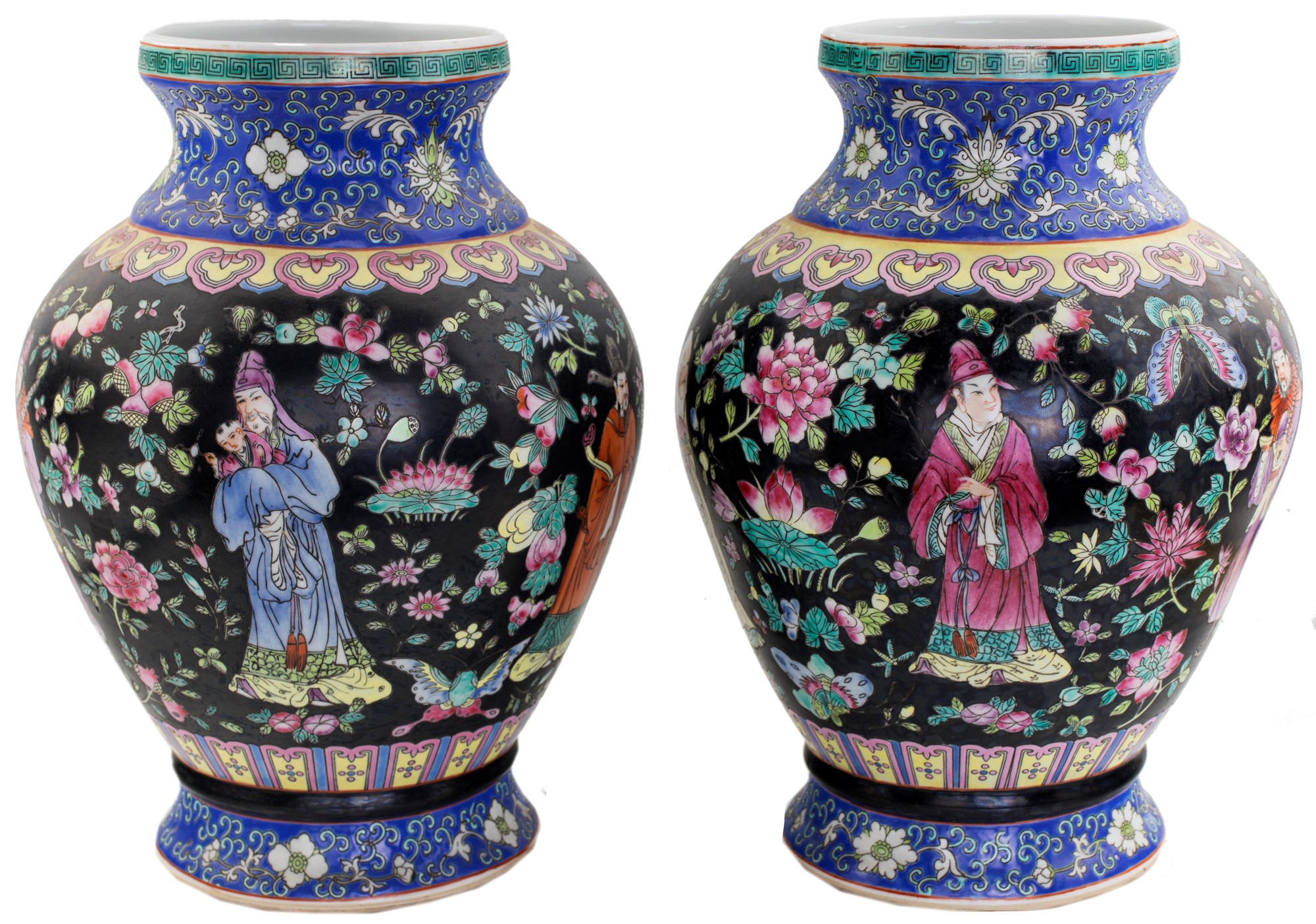Coppia di vasi in porcellana policroma, Cina, XX secolo di forma sferica decorati a tutto tondo da cinque figure orientali su fondo nero circondate da fitta ornamentazione floreale; base e collo azzurri , altezza cm 40