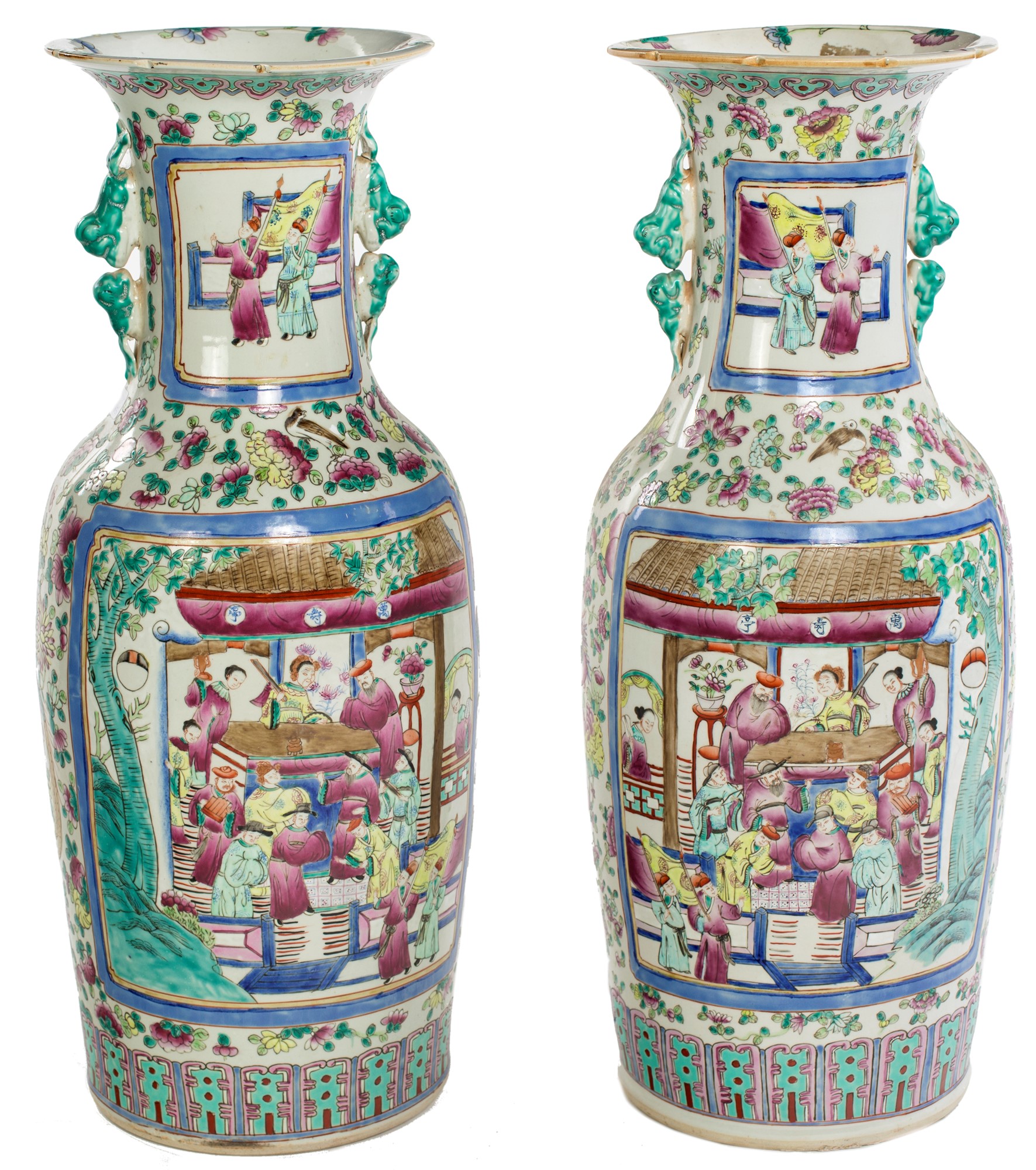 Coppia di vasi in porcellana, Cina lungo la tesa tre composizioni floreali; marchio in rosso sotto la base, altezza cm 61 e cm 62
