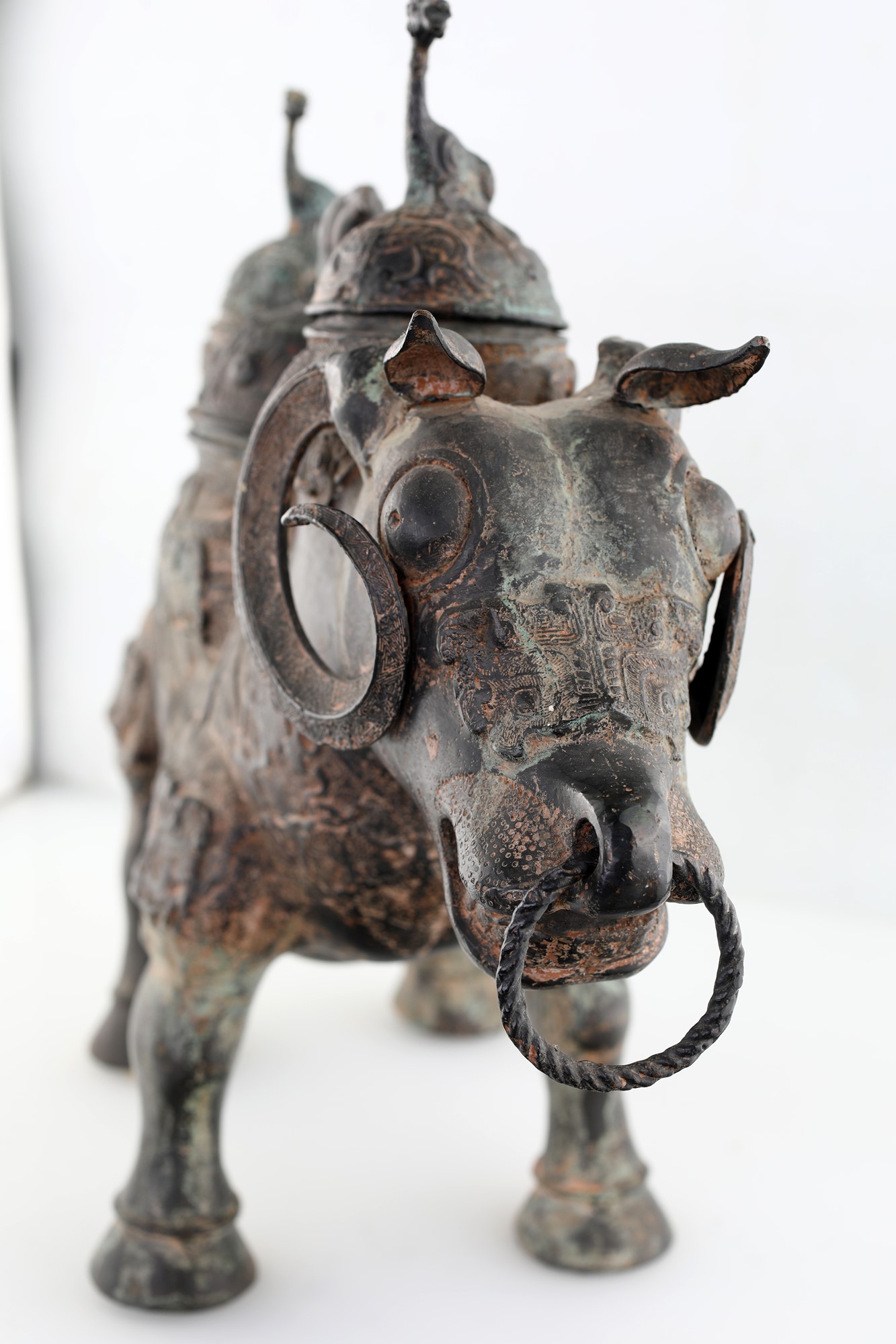 Antico incensiere zoomorfo in bronzo brunito, Cina a forma di caprone con tre...
