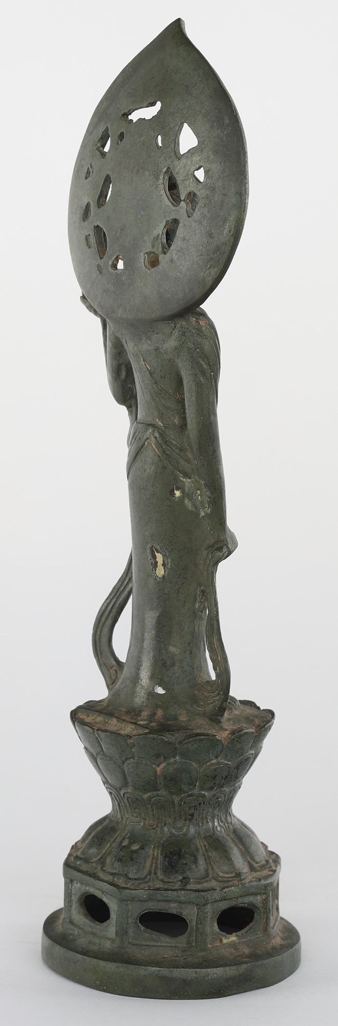 Bodhisattva Guanyin in bronzo, Cina, dinastia Qing, prima metà del XIX secolo ritratta in piedi con l'ampolla dell'ambrosia e aura, cm 24x6,5