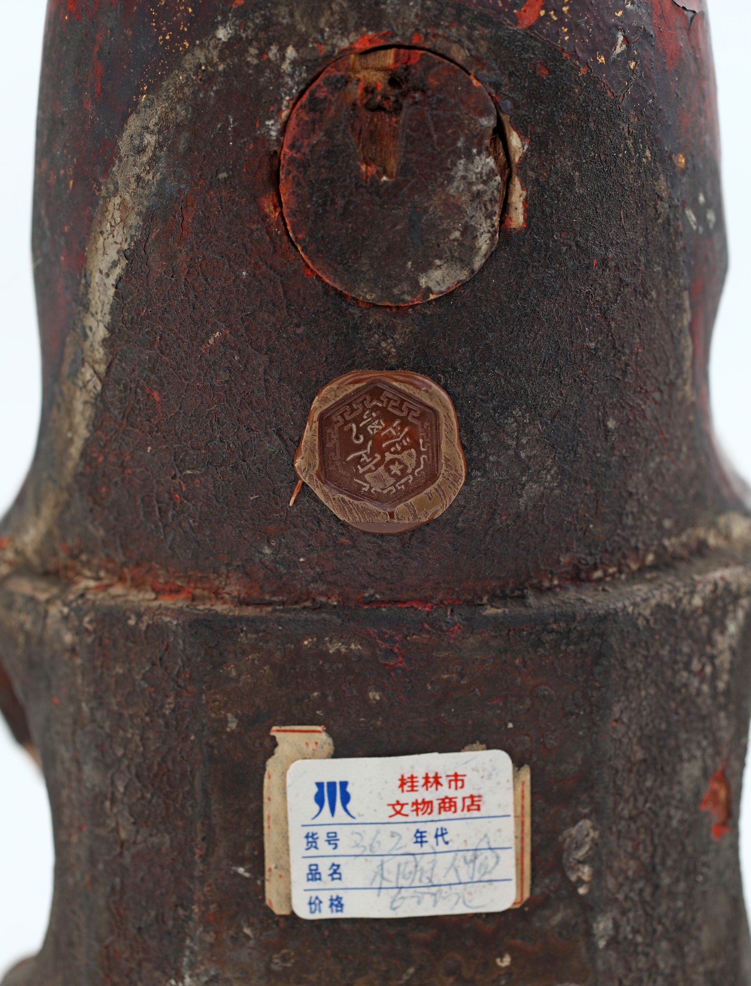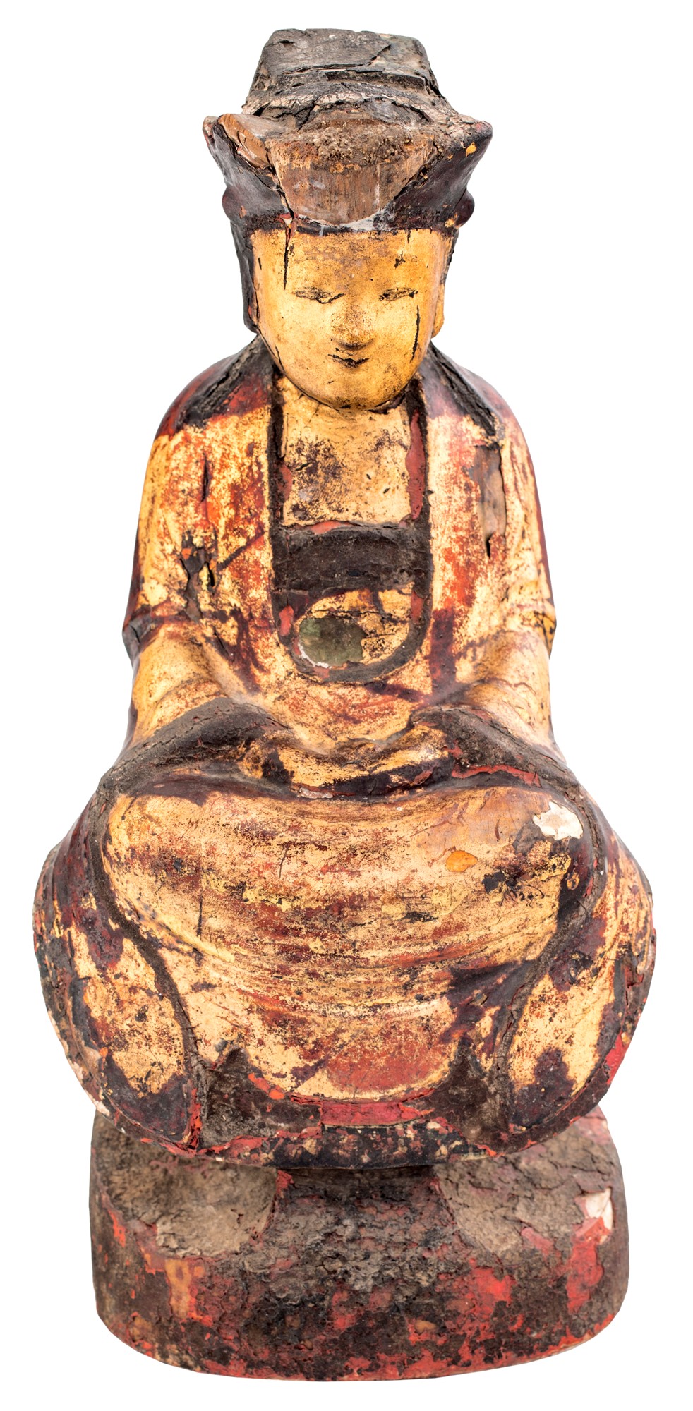 Figura di Buddha in trono in legno laccato e dorato, Cina, dinastia Qing, epoca dell'Imperatore ChienLung (1736 - 1796) Sul retro un'apertura circolare celata da un tappo ospita un piccolo vano scavato all'interno della scultura, sotto al quale vi è un timbro in ceralacca ed etichetta di provenienza. Provvista di fattura d'acquisto del 1991 presso un negozio di antiquariato di Guilin, altezza cm 29