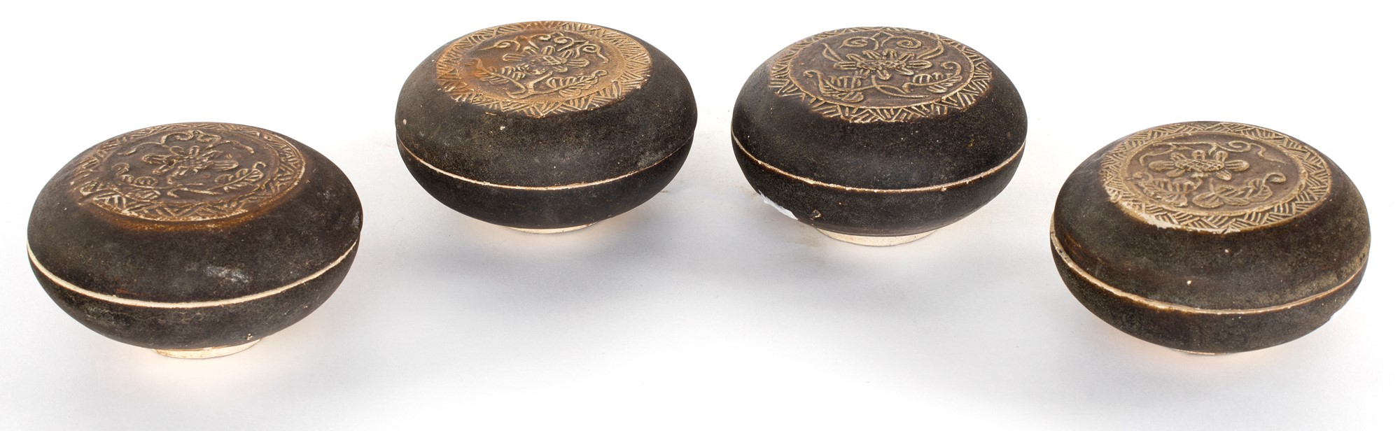 Quattro contenitori portaessenze in ceramica invetriata bruna, Cina, dinastia Qing, inizio del XVIII secolo di forma sferica schiacciata con coperchio decorato con fiori graffiti, 5x9,5