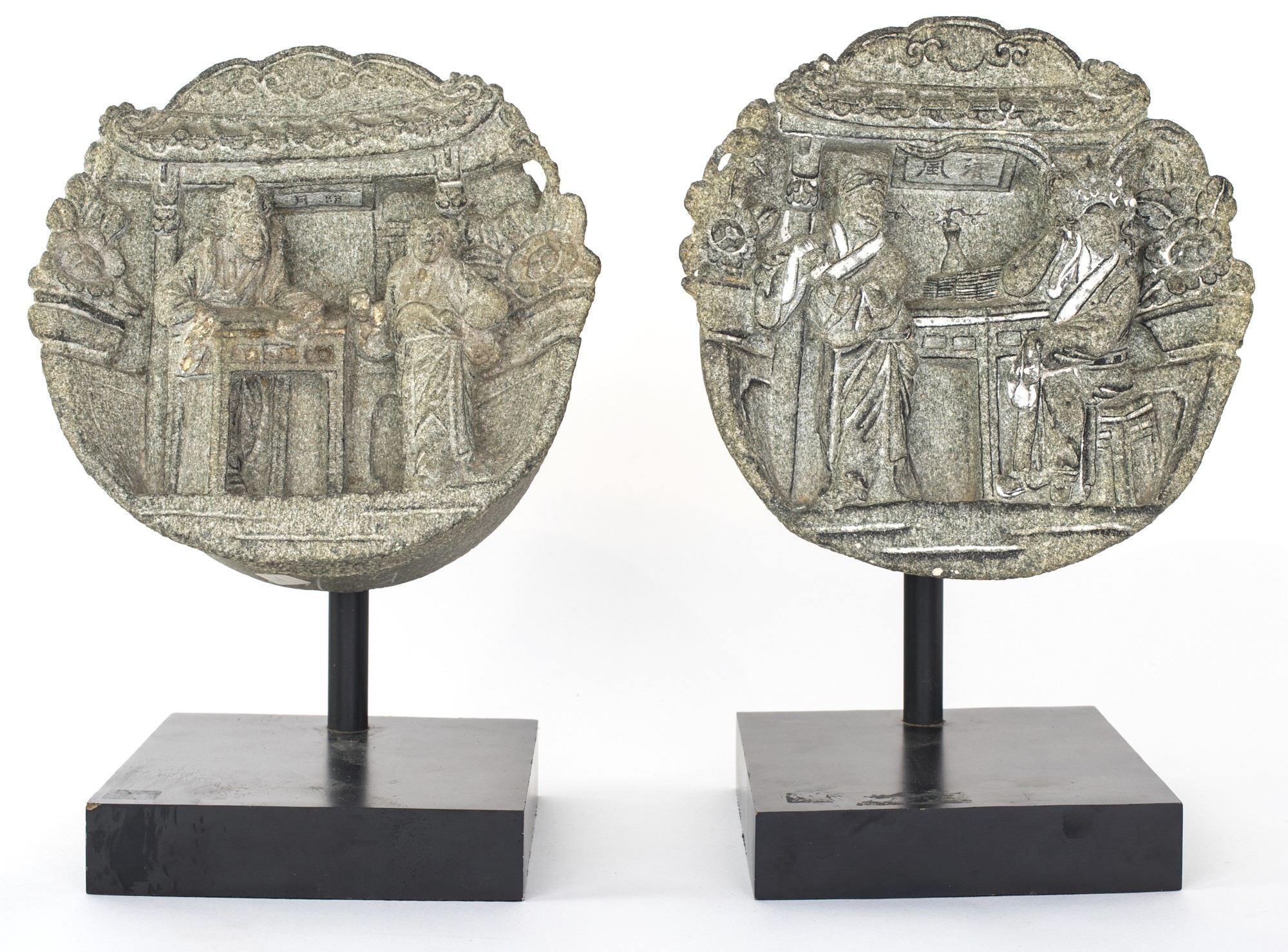 Coppia di altorilievi circolari in basalto, Cina, dinastia Qing, XIX secolo con scene di scuola Taoista. Erano inseriti nel muro esterno di fianco alla porta di ingresso della casa. Corredati di attestato di libera circolazione., diametro cm 24