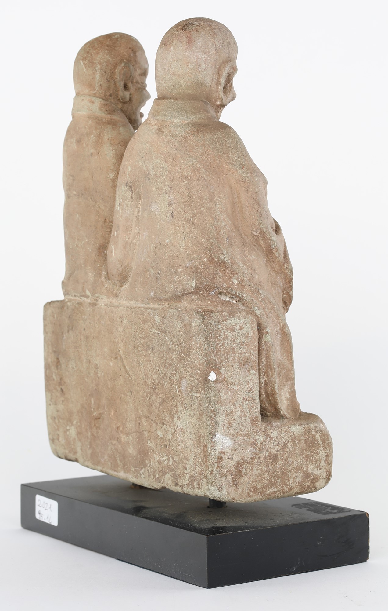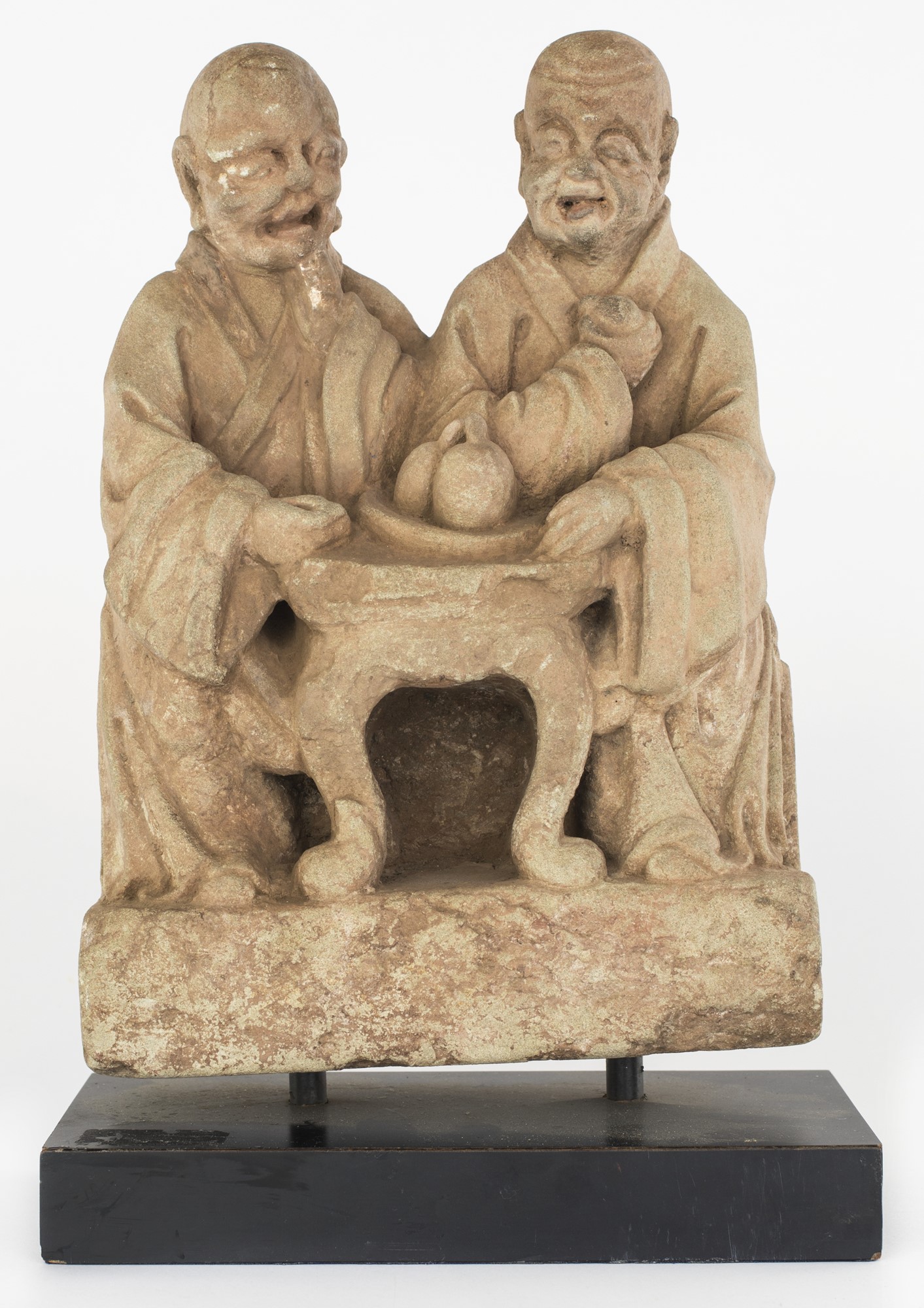 Gruppo scultoreo in pietra, Cina, dinastia Qing, XVIII secolo raffigurante due anziani monaci seduti con pesche, frutto simbolo dell'immortalità. Accompagnato da attestato di libera circolazione, altezza cm 27
