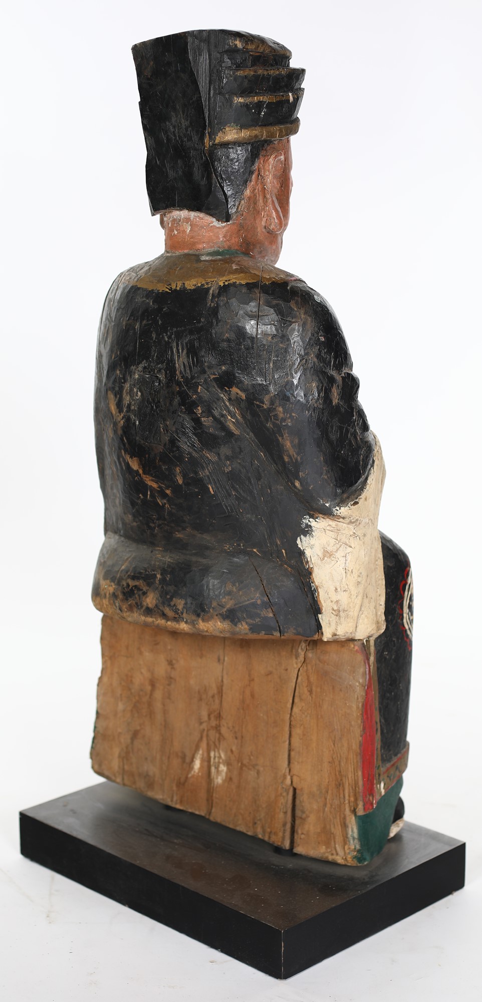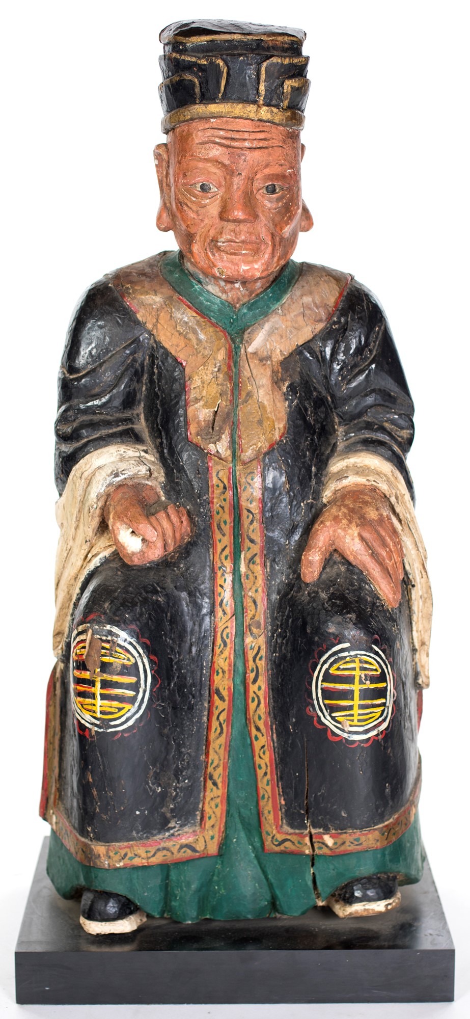 Grande figura in legno policromo, Yunnan, Cina, XIX secolo raffigurante un notabile taoista cinese; l'abito, il copricapo e i monogrammi sulle ginocchia testimoniano l'importanza del personaggio. Lo Yunnan è una regione della Cina occidentale, culla di molte etnie nomani tribali e zona di accesso agli altopiani himalayani, 85x38