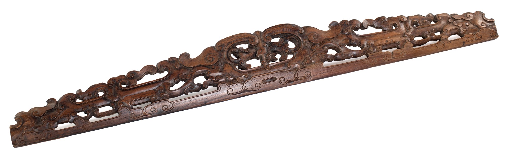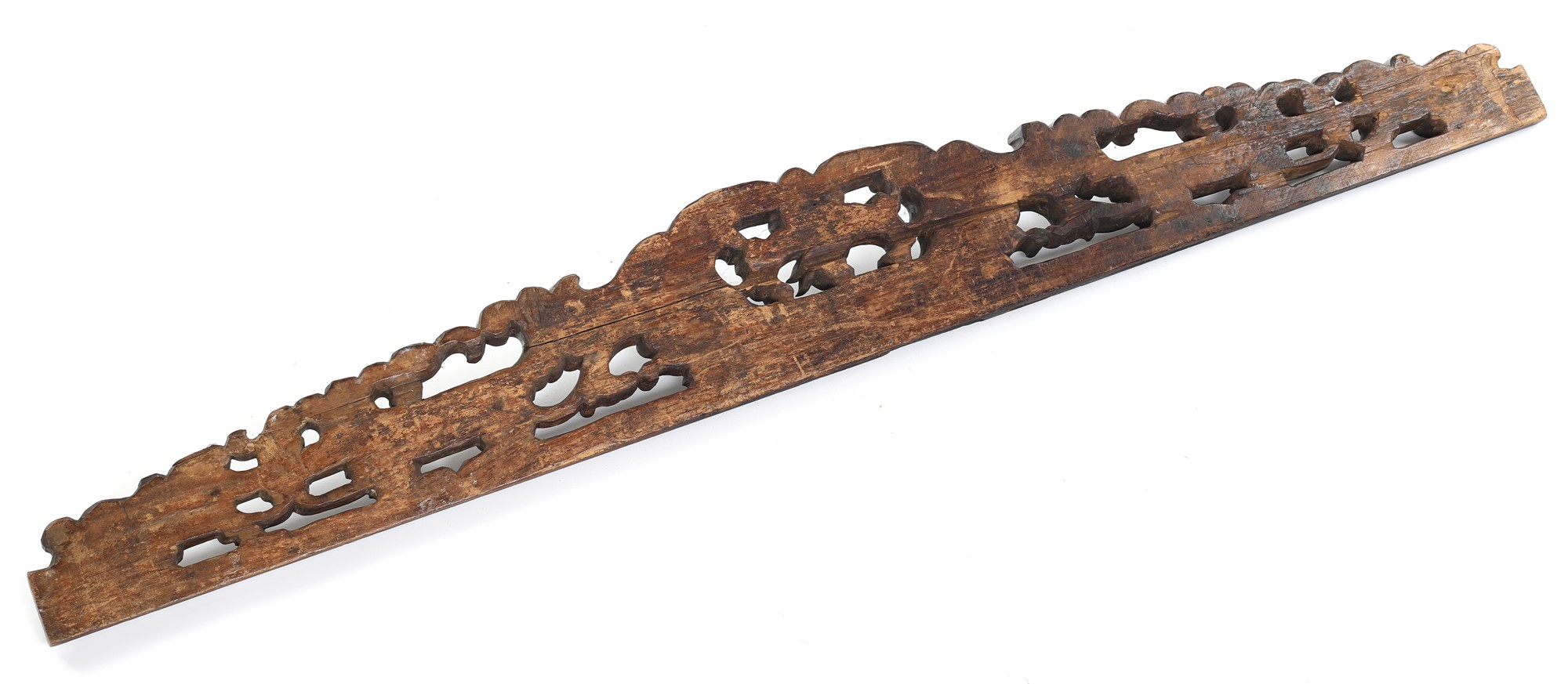 Fregio in legno intagliato, Cina, dinastia Qing, prima metà del XIX secolo decorato in profondo rilievo a motivi tradizionali, 20x153