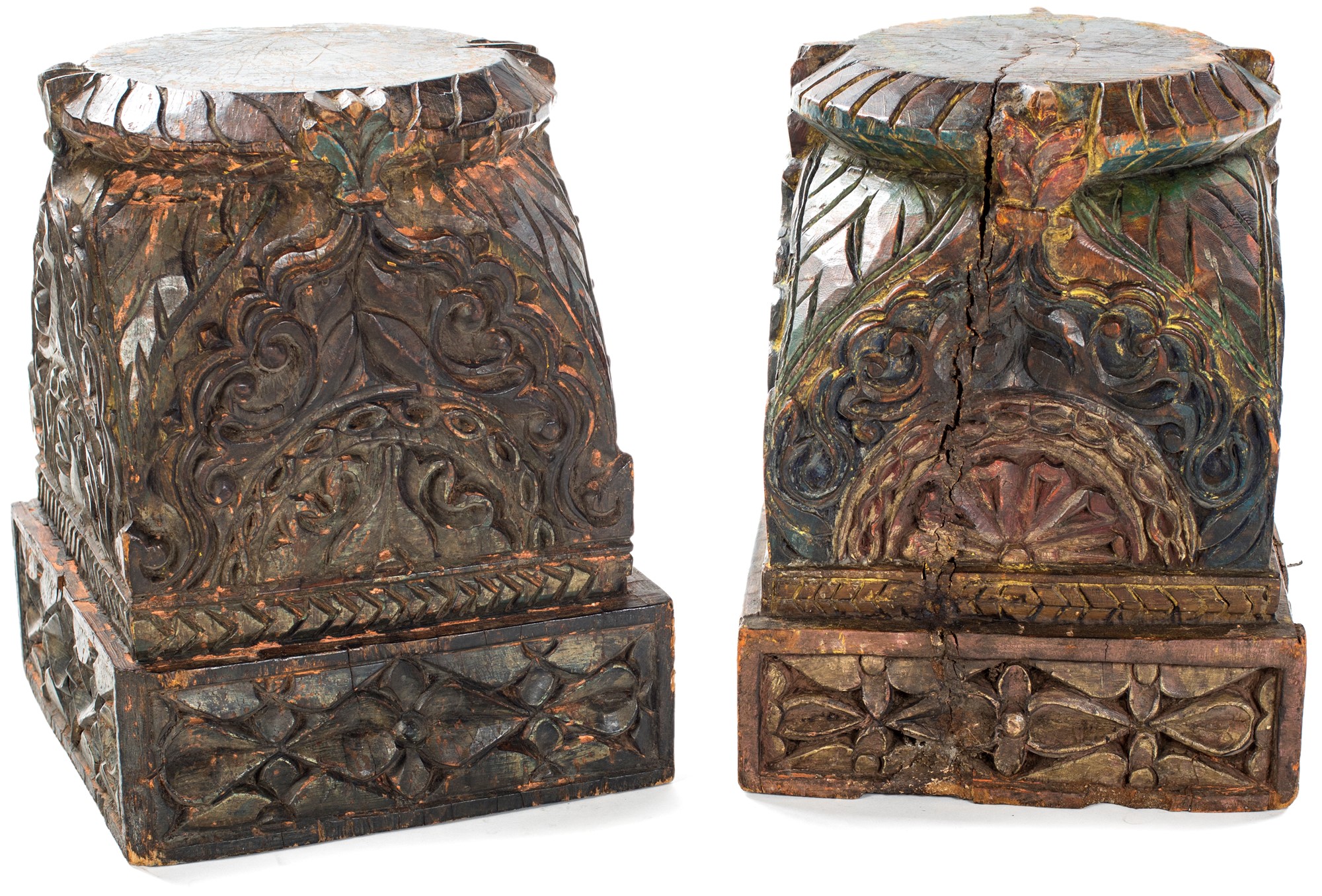 Coppia di basi in legno intagliato, Cina decorate in bassorilievo a motivi floreali e vegetali racchiusi entro riserve; tracce di policromia , 38x30x30 - piano d'appoggio diametro cm 20