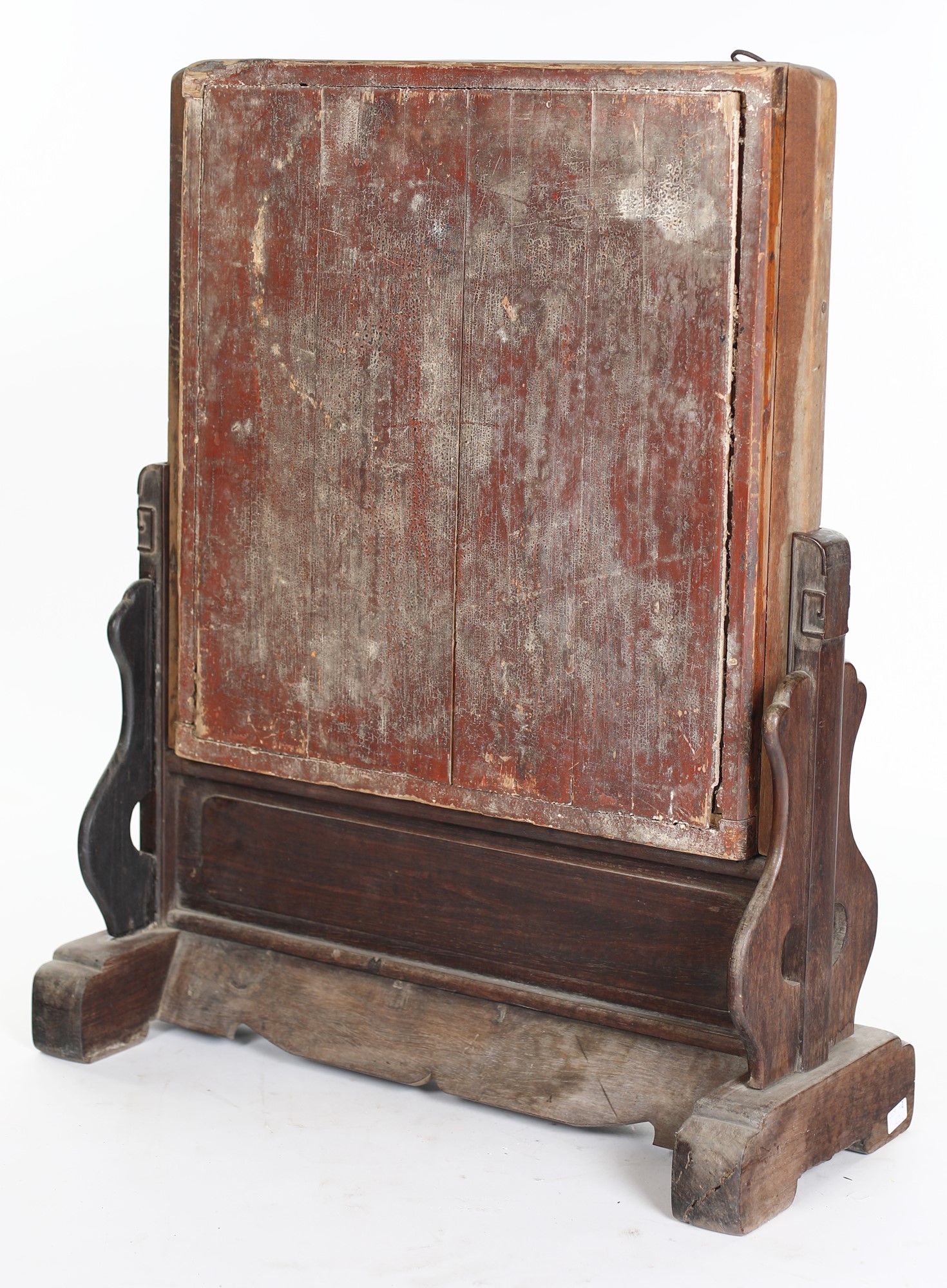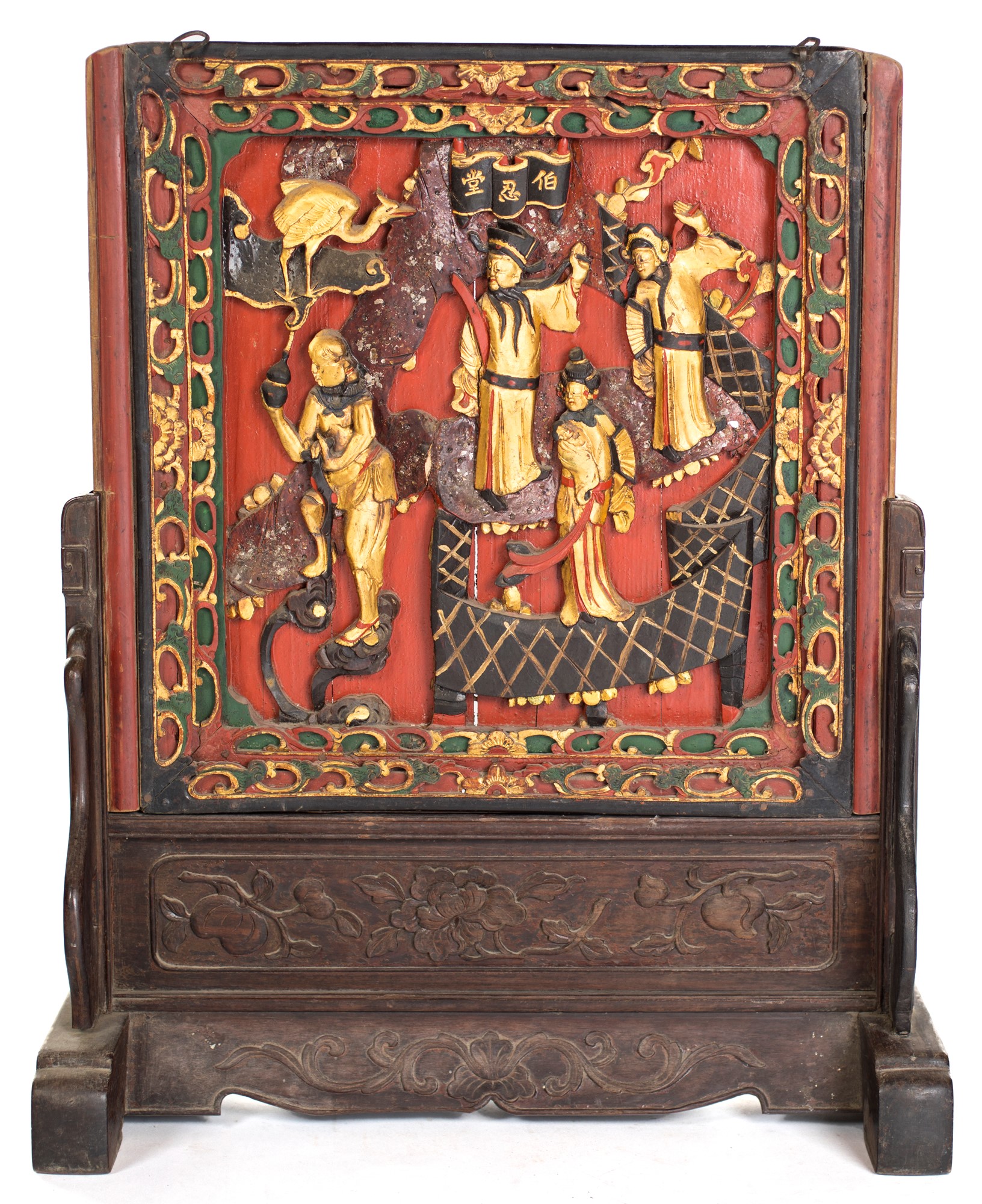 Schermo in legno intagliato, laccato rosso e dorato, Cina, dinastia Qing,...