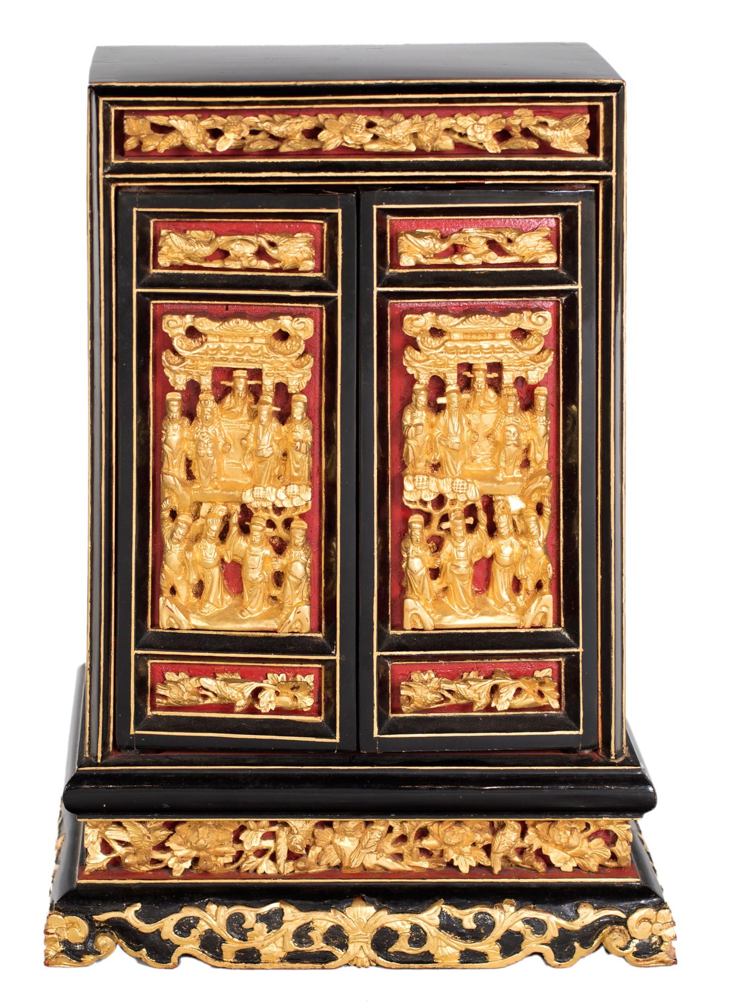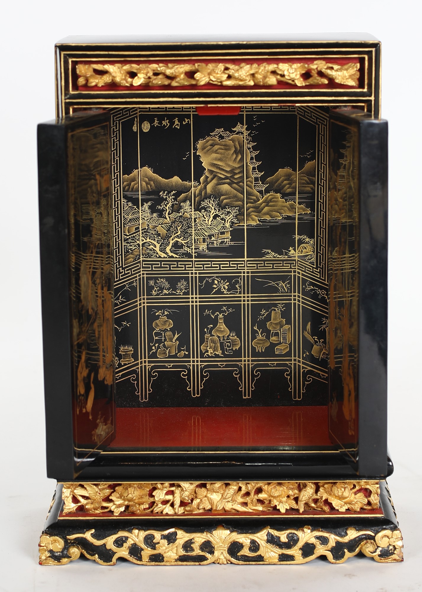 Piccolo altare da viaggio in legno laccato e dorato, Cina, XX secolo a due ante con riquadri decorati in bassorilievo a motivi naturalistici e scene taoiste dorate su fondo rosso; struttura nera con profili dorati, 44x30