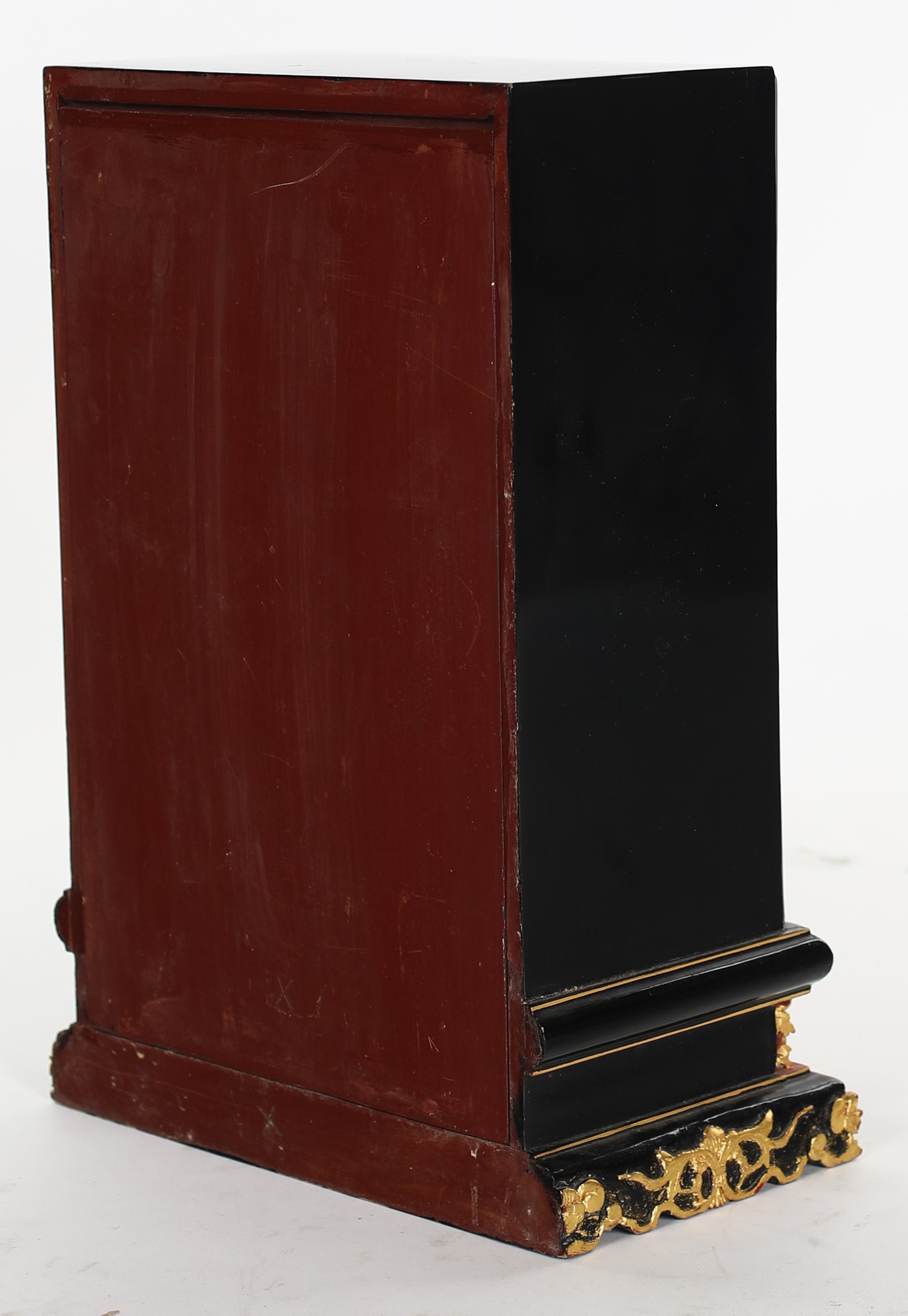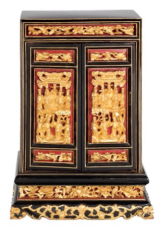 Piccolo altare da viaggio in legno laccato e dorato, Cina, XX secolo a due...